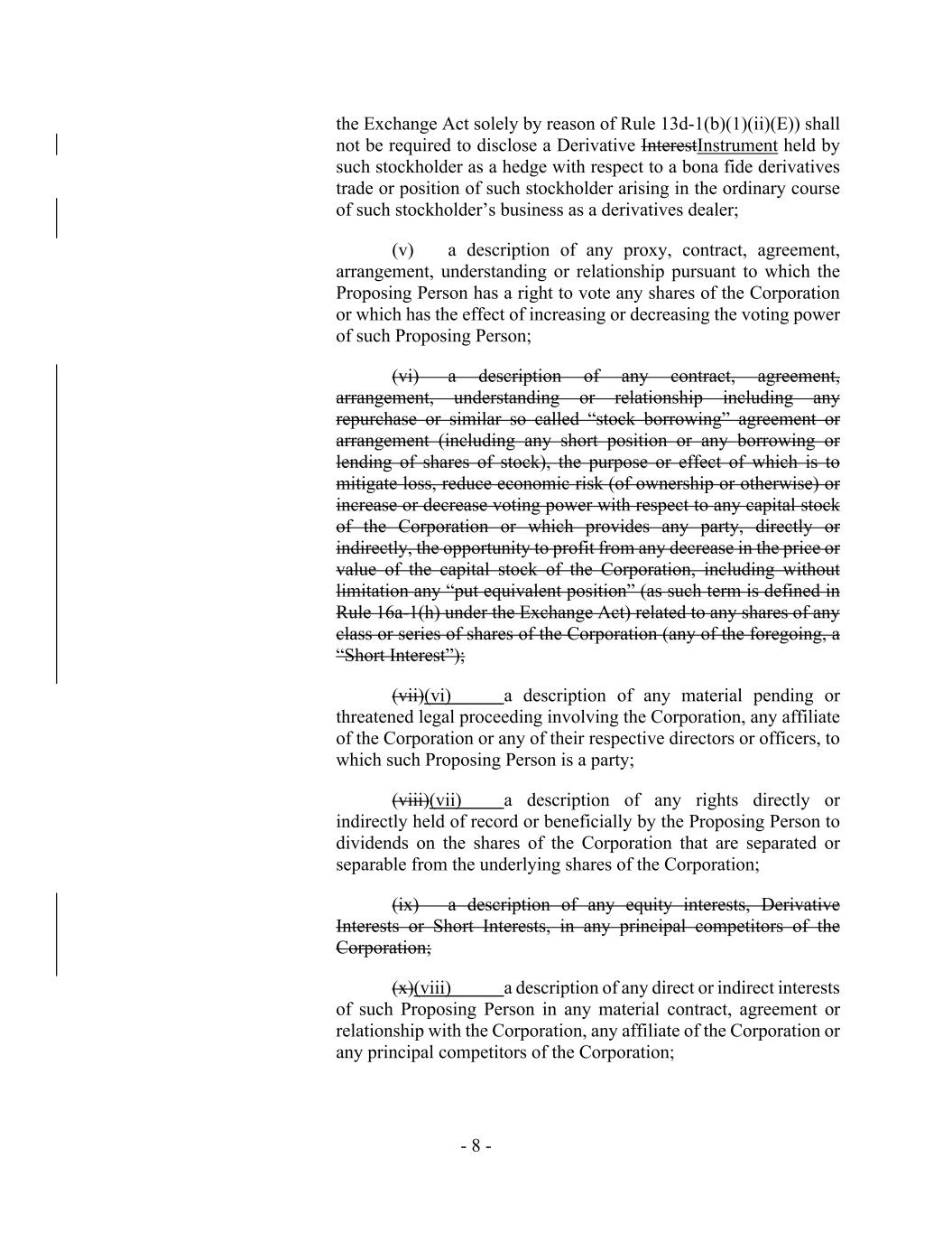 - 8 - the Exchange Act solely by reason of Rule 13d-1(b)(1)(ii)(E)) shall not be required to disclose a Derivative InterestInstrument held by such stockholder as a hedge with respect to a bona fide derivatives trade or position of such stockholder arising in the ordinary course of such stockholder’s business as a derivatives dealer; (v) a description of any proxy, contract, agreement, arrangement, understanding or relationship pursuant to which the Proposing Person has a right to vote any shares of the Corporation or which has the effect of increasing or decreasing the voting power of such Proposing Person; (vi) a description of any contract, agreement, arrangement, understanding or relationship including any repurchase or similar so called “stock borrowing” agreement or arrangement (including any short position or any borrowing or lending of shares of stock), the purpose or effect of which is to mitigate loss, reduce economic risk (of ownership or otherwise) or increase or decrease voting power with respect to any capital stock of the Corporation or which provides any party, directly or indirectly, the opportunity to profit from any decrease in the price or value of the capital stock of the Corporation, including without limitation any “put equivalent position” (as such term is defined in Rule 16a-1(h) under the Exchange Act) related to any shares of any class or series of shares of the Corporation (any of the foregoing, a “Short Interest”); (vii)(vi) a description of any material pending or threatened legal proceeding involving the Corporation, any affiliate of the Corporation or any of their respective directors or officers, to which such Proposing Person is a party; (viii)(vii) a description of any rights directly or indirectly held of record or beneficially by the Proposing Person to dividends on the shares of the Corporation that are separated or separable from the underlying shares of the Corporation; (ix) a description of any equity interests, Derivative Interests or Short Interests, in any principal competitors of the Corporation; (x)(viii) a description of any direct or indirect interests of such Proposing Person in any material contract, agreement or relationship with the Corporation, any affiliate of the Corporation or any principal competitors of the Corporation;