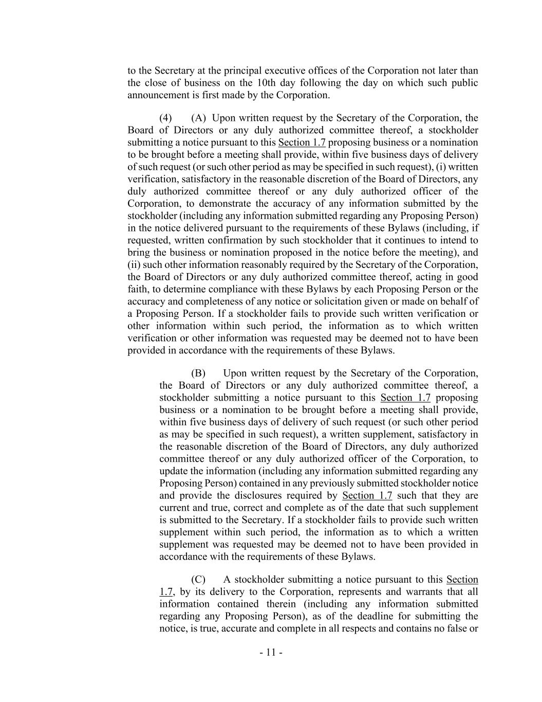 - 11 - to the Secretary at the principal executive offices of the Corporation not later than the close of business on the 10th day following the day on which such public announcement is first made by the Corporation. (4) (A) Upon written request by the Secretary of the Corporation, the Board of Directors or any duly authorized committee thereof, a stockholder submitting a notice pursuant to this Section 1.7 proposing business or a nomination to be brought before a meeting shall provide, within five business days of delivery of such request (or such other period as may be specified in such request), (i) written verification, satisfactory in the reasonable discretion of the Board of Directors, any duly authorized committee thereof or any duly authorized officer of the Corporation, to demonstrate the accuracy of any information submitted by the stockholder (including any information submitted regarding any Proposing Person) in the notice delivered pursuant to the requirements of these Bylaws (including, if requested, written confirmation by such stockholder that it continues to intend to bring the business or nomination proposed in the notice before the meeting), and (ii) such other information reasonably required by the Secretary of the Corporation, the Board of Directors or any duly authorized committee thereof, acting in good faith, to determine compliance with these Bylaws by each Proposing Person or the accuracy and completeness of any notice or solicitation given or made on behalf of a Proposing Person. If a stockholder fails to provide such written verification or other information within such period, the information as to which written verification or other information was requested may be deemed not to have been provided in accordance with the requirements of these Bylaws. (B) Upon written request by the Secretary of the Corporation, the Board of Directors or any duly authorized committee thereof, a stockholder submitting a notice pursuant to this Section 1.7 proposing business or a nomination to be brought before a meeting shall provide, within five business days of delivery of such request (or such other period as may be specified in such request), a written supplement, satisfactory in the reasonable discretion of the Board of Directors, any duly authorized committee thereof or any duly authorized officer of the Corporation, to update the information (including any information submitted regarding any Proposing Person) contained in any previously submitted stockholder notice and provide the disclosures required by Section 1.7 such that they are current and true, correct and complete as of the date that such supplement is submitted to the Secretary. If a stockholder fails to provide such written supplement within such period, the information as to which a written supplement was requested may be deemed not to have been provided in accordance with the requirements of these Bylaws. (C) A stockholder submitting a notice pursuant to this Section 1.7, by its delivery to the Corporation, represents and warrants that all information contained therein (including any information submitted regarding any Proposing Person), as of the deadline for submitting the notice, is true, accurate and complete in all respects and contains no false or