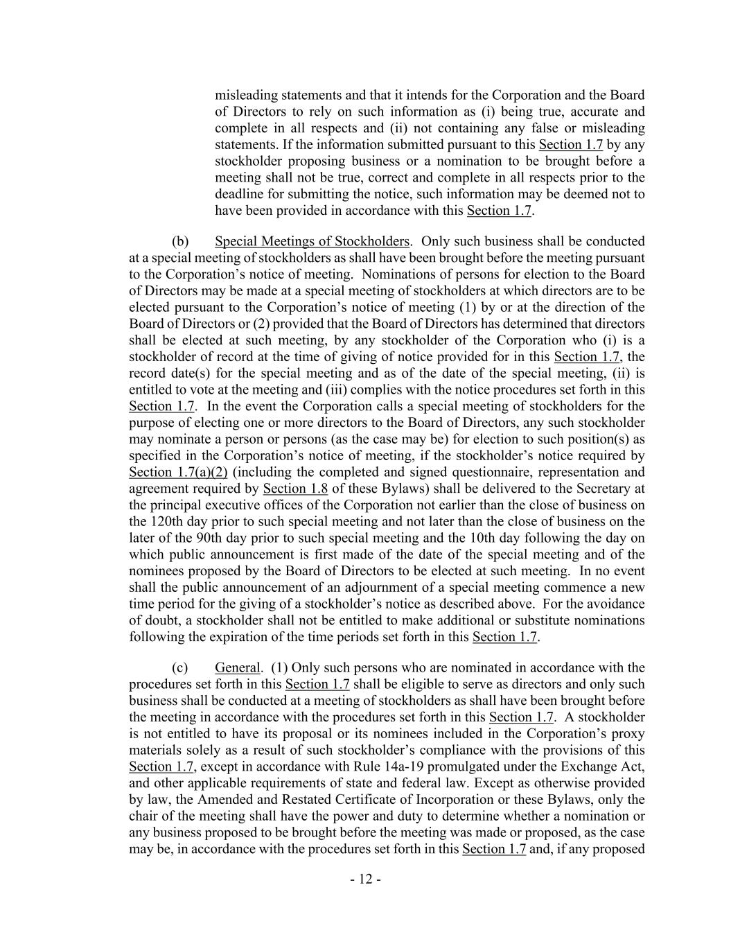 - 12 - misleading statements and that it intends for the Corporation and the Board of Directors to rely on such information as (i) being true, accurate and complete in all respects and (ii) not containing any false or misleading statements. If the information submitted pursuant to this Section 1.7 by any stockholder proposing business or a nomination to be brought before a meeting shall not be true, correct and complete in all respects prior to the deadline for submitting the notice, such information may be deemed not to have been provided in accordance with this Section 1.7. (b) Special Meetings of Stockholders. Only such business shall be conducted at a special meeting of stockholders as shall have been brought before the meeting pursuant to the Corporation’s notice of meeting. Nominations of persons for election to the Board of Directors may be made at a special meeting of stockholders at which directors are to be elected pursuant to the Corporation’s notice of meeting (1) by or at the direction of the Board of Directors or (2) provided that the Board of Directors has determined that directors shall be elected at such meeting, by any stockholder of the Corporation who (i) is a stockholder of record at the time of giving of notice provided for in this Section 1.7, the record date(s) for the special meeting and as of the date of the special meeting, (ii) is entitled to vote at the meeting and (iii) complies with the notice procedures set forth in this Section 1.7. In the event the Corporation calls a special meeting of stockholders for the purpose of electing one or more directors to the Board of Directors, any such stockholder may nominate a person or persons (as the case may be) for election to such position(s) as specified in the Corporation’s notice of meeting, if the stockholder’s notice required by Section 1.7(a)(2) (including the completed and signed questionnaire, representation and agreement required by Section 1.8 of these Bylaws) shall be delivered to the Secretary at the principal executive offices of the Corporation not earlier than the close of business on the 120th day prior to such special meeting and not later than the close of business on the later of the 90th day prior to such special meeting and the 10th day following the day on which public announcement is first made of the date of the special meeting and of the nominees proposed by the Board of Directors to be elected at such meeting. In no event shall the public announcement of an adjournment of a special meeting commence a new time period for the giving of a stockholder’s notice as described above. For the avoidance of doubt, a stockholder shall not be entitled to make additional or substitute nominations following the expiration of the time periods set forth in this Section 1.7. (c) General. (1) Only such persons who are nominated in accordance with the procedures set forth in this Section 1.7 shall be eligible to serve as directors and only such business shall be conducted at a meeting of stockholders as shall have been brought before the meeting in accordance with the procedures set forth in this Section 1.7. A stockholder is not entitled to have its proposal or its nominees included in the Corporation’s proxy materials solely as a result of such stockholder’s compliance with the provisions of this Section 1.7, except in accordance with Rule 14a-19 promulgated under the Exchange Act, and other applicable requirements of state and federal law. Except as otherwise provided by law, the Amended and Restated Certificate of Incorporation or these Bylaws, only the chair of the meeting shall have the power and duty to determine whether a nomination or any business proposed to be brought before the meeting was made or proposed, as the case may be, in accordance with the procedures set forth in this Section 1.7 and, if any proposed