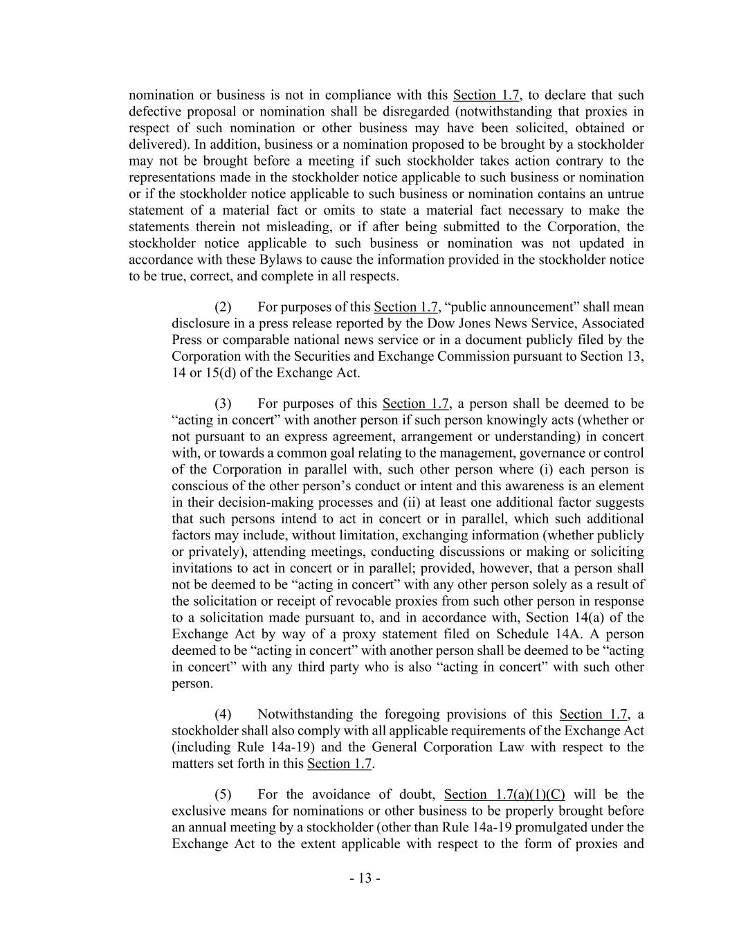 - 13 - nomination or business is not in compliance with this Section 1.7, to declare that such defective proposal or nomination shall be disregarded (notwithstanding that proxies in respect of such nomination or other business may have been solicited, obtained or delivered). In addition, business or a nomination proposed to be brought by a stockholder may not be brought before a meeting if such stockholder takes action contrary to the representations made in the stockholder notice applicable to such business or nomination or if the stockholder notice applicable to such business or nomination contains an untrue statement of a material fact or omits to state a material fact necessary to make the statements therein not misleading, or if after being submitted to the Corporation, the stockholder notice applicable to such business or nomination was not updated in accordance with these Bylaws to cause the information provided in the stockholder notice to be true, correct, and complete in all respects. (2) For purposes of this Section 1.7, “public announcement” shall mean disclosure in a press release reported by the Dow Jones News Service, Associated Press or comparable national news service or in a document publicly filed by the Corporation with the Securities and Exchange Commission pursuant to Section 13, 14 or 15(d) of the Exchange Act. (3) For purposes of this Section 1.7, a person shall be deemed to be “acting in concert” with another person if such person knowingly acts (whether or not pursuant to an express agreement, arrangement or understanding) in concert with, or towards a common goal relating to the management, governance or control of the Corporation in parallel with, such other person where (i) each person is conscious of the other person’s conduct or intent and this awareness is an element in their decision-making processes and (ii) at least one additional factor suggests that such persons intend to act in concert or in parallel, which such additional factors may include, without limitation, exchanging information (whether publicly or privately), attending meetings, conducting discussions or making or soliciting invitations to act in concert or in parallel; provided, however, that a person shall not be deemed to be “acting in concert” with any other person solely as a result of the solicitation or receipt of revocable proxies from such other person in response to a solicitation made pursuant to, and in accordance with, Section 14(a) of the Exchange Act by way of a proxy statement filed on Schedule 14A. A person deemed to be “acting in concert” with another person shall be deemed to be “acting in concert” with any third party who is also “acting in concert” with such other person. (4) Notwithstanding the foregoing provisions of this Section 1.7, a stockholder shall also comply with all applicable requirements of the Exchange Act (including Rule 14a-19) and the General Corporation Law with respect to the matters set forth in this Section 1.7. (5) For the avoidance of doubt, Section 1.7(a)(1)(C) will be the exclusive means for nominations or other business to be properly brought before an annual meeting by a stockholder (other than Rule 14a-19 promulgated under the Exchange Act to the extent applicable with respect to the form of proxies and