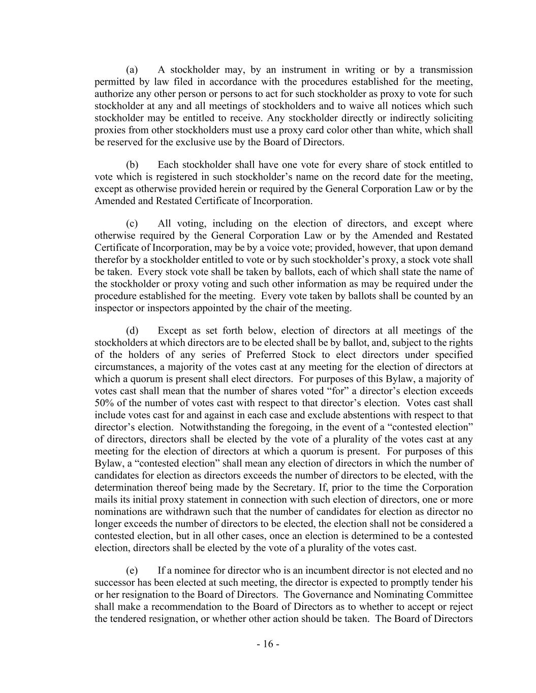 - 16 - (a) A stockholder may, by an instrument in writing or by a transmission permitted by law filed in accordance with the procedures established for the meeting, authorize any other person or persons to act for such stockholder as proxy to vote for such stockholder at any and all meetings of stockholders and to waive all notices which such stockholder may be entitled to receive. Any stockholder directly or indirectly soliciting proxies from other stockholders must use a proxy card color other than white, which shall be reserved for the exclusive use by the Board of Directors. (b) Each stockholder shall have one vote for every share of stock entitled to vote which is registered in such stockholder’s name on the record date for the meeting, except as otherwise provided herein or required by the General Corporation Law or by the Amended and Restated Certificate of Incorporation. (c) All voting, including on the election of directors, and except where otherwise required by the General Corporation Law or by the Amended and Restated Certificate of Incorporation, may be by a voice vote; provided, however, that upon demand therefor by a stockholder entitled to vote or by such stockholder’s proxy, a stock vote shall be taken. Every stock vote shall be taken by ballots, each of which shall state the name of the stockholder or proxy voting and such other information as may be required under the procedure established for the meeting. Every vote taken by ballots shall be counted by an inspector or inspectors appointed by the chair of the meeting. (d) Except as set forth below, election of directors at all meetings of the stockholders at which directors are to be elected shall be by ballot, and, subject to the rights of the holders of any series of Preferred Stock to elect directors under specified circumstances, a majority of the votes cast at any meeting for the election of directors at which a quorum is present shall elect directors. For purposes of this Bylaw, a majority of votes cast shall mean that the number of shares voted “for” a director’s election exceeds 50% of the number of votes cast with respect to that director’s election. Votes cast shall include votes cast for and against in each case and exclude abstentions with respect to that director’s election. Notwithstanding the foregoing, in the event of a “contested election” of directors, directors shall be elected by the vote of a plurality of the votes cast at any meeting for the election of directors at which a quorum is present. For purposes of this Bylaw, a “contested election” shall mean any election of directors in which the number of candidates for election as directors exceeds the number of directors to be elected, with the determination thereof being made by the Secretary. If, prior to the time the Corporation mails its initial proxy statement in connection with such election of directors, one or more nominations are withdrawn such that the number of candidates for election as director no longer exceeds the number of directors to be elected, the election shall not be considered a contested election, but in all other cases, once an election is determined to be a contested election, directors shall be elected by the vote of a plurality of the votes cast. (e) If a nominee for director who is an incumbent director is not elected and no successor has been elected at such meeting, the director is expected to promptly tender his or her resignation to the Board of Directors. The Governance and Nominating Committee shall make a recommendation to the Board of Directors as to whether to accept or reject the tendered resignation, or whether other action should be taken. The Board of Directors