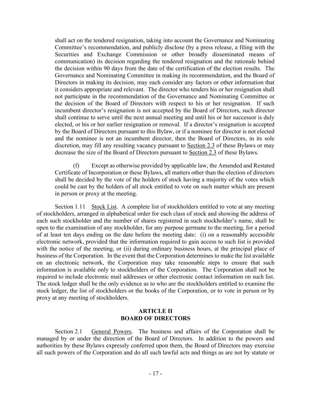 - 17 - shall act on the tendered resignation, taking into account the Governance and Nominating Committee’s recommendation, and publicly disclose (by a press release, a filing with the Securities and Exchange Commission or other broadly disseminated means of communication) its decision regarding the tendered resignation and the rationale behind the decision within 90 days from the date of the certification of the election results. The Governance and Nominating Committee in making its recommendation, and the Board of Directors in making its decision, may each consider any factors or other information that it considers appropriate and relevant. The director who tenders his or her resignation shall not participate in the recommendation of the Governance and Nominating Committee or the decision of the Board of Directors with respect to his or her resignation. If such incumbent director’s resignation is not accepted by the Board of Directors, such director shall continue to serve until the next annual meeting and until his or her successor is duly elected, or his or her earlier resignation or removal. If a director’s resignation is accepted by the Board of Directors pursuant to this Bylaw, or if a nominee for director is not elected and the nominee is not an incumbent director, then the Board of Directors, in its sole discretion, may fill any resulting vacancy pursuant to Section 2.3 of these Bylaws or may decrease the size of the Board of Directors pursuant to Section 2.3 of these Bylaws. (f) Except as otherwise provided by applicable law, the Amended and Restated Certificate of Incorporation or these Bylaws, all matters other than the election of directors shall be decided by the vote of the holders of stock having a majority of the votes which could be cast by the holders of all stock entitled to vote on such matter which are present in person or proxy at the meeting. Section 1.11 Stock List. A complete list of stockholders entitled to vote at any meeting of stockholders, arranged in alphabetical order for each class of stock and showing the address of each such stockholder and the number of shares registered in such stockholder’s name, shall be open to the examination of any stockholder, for any purpose germane to the meeting, for a period of at least ten days ending on the date before the meeting date: (i) on a reasonably accessible electronic network, provided that the information required to gain access to such list is provided with the notice of the meeting, or (ii) during ordinary business hours, at the principal place of business of the Corporation. In the event that the Corporation determines to make the list available on an electronic network, the Corporation may take reasonable steps to ensure that such information is available only to stockholders of the Corporation. The Corporation shall not be required to include electronic mail addresses or other electronic contact information on such list. The stock ledger shall be the only evidence as to who are the stockholders entitled to examine the stock ledger, the list of stockholders or the books of the Corporation, or to vote in person or by proxy at any meeting of stockholders. ARTICLE II BOARD OF DIRECTORS Section 2.1 General Powers. The business and affairs of the Corporation shall be managed by or under the direction of the Board of Directors. In addition to the powers and authorities by these Bylaws expressly conferred upon them, the Board of Directors may exercise all such powers of the Corporation and do all such lawful acts and things as are not by statute or