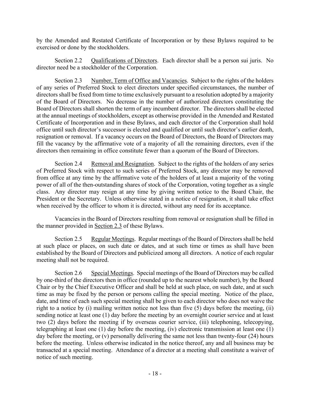 - 18 - by the Amended and Restated Certificate of Incorporation or by these Bylaws required to be exercised or done by the stockholders. Section 2.2 Qualifications of Directors. Each director shall be a person sui juris. No director need be a stockholder of the Corporation. Section 2.3 Number, Term of Office and Vacancies. Subject to the rights of the holders of any series of Preferred Stock to elect directors under specified circumstances, the number of directors shall be fixed from time to time exclusively pursuant to a resolution adopted by a majority of the Board of Directors. No decrease in the number of authorized directors constituting the Board of Directors shall shorten the term of any incumbent director. The directors shall be elected at the annual meetings of stockholders, except as otherwise provided in the Amended and Restated Certificate of Incorporation and in these Bylaws, and each director of the Corporation shall hold office until such director’s successor is elected and qualified or until such director’s earlier death, resignation or removal. If a vacancy occurs on the Board of Directors, the Board of Directors may fill the vacancy by the affirmative vote of a majority of all the remaining directors, even if the directors then remaining in office constitute fewer than a quorum of the Board of Directors. Section 2.4 Removal and Resignation. Subject to the rights of the holders of any series of Preferred Stock with respect to such series of Preferred Stock, any director may be removed from office at any time by the affirmative vote of the holders of at least a majority of the voting power of all of the then-outstanding shares of stock of the Corporation, voting together as a single class. Any director may resign at any time by giving written notice to the Board Chair, the President or the Secretary. Unless otherwise stated in a notice of resignation, it shall take effect when received by the officer to whom it is directed, without any need for its acceptance. Vacancies in the Board of Directors resulting from removal or resignation shall be filled in the manner provided in Section 2.3 of these Bylaws. Section 2.5 Regular Meetings. Regular meetings of the Board of Directors shall be held at such place or places, on such date or dates, and at such time or times as shall have been established by the Board of Directors and publicized among all directors. A notice of each regular meeting shall not be required. Section 2.6 Special Meetings. Special meetings of the Board of Directors may be called by one-third of the directors then in office (rounded up to the nearest whole number), by the Board Chair or by the Chief Executive Officer and shall be held at such place, on such date, and at such time as may be fixed by the person or persons calling the special meeting. Notice of the place, date, and time of each such special meeting shall be given to each director who does not waive the right to a notice by (i) mailing written notice not less than five (5) days before the meeting, (ii) sending notice at least one (1) day before the meeting by an overnight courier service and at least two (2) days before the meeting if by overseas courier service, (iii) telephoning, telecopying, telegraphing at least one (1) day before the meeting, (iv) electronic transmission at least one (1) day before the meeting, or (v) personally delivering the same not less than twenty-four (24) hours before the meeting. Unless otherwise indicated in the notice thereof, any and all business may be transacted at a special meeting. Attendance of a director at a meeting shall constitute a waiver of notice of such meeting.