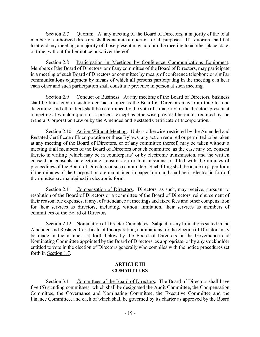 - 19 - Section 2.7 Quorum. At any meeting of the Board of Directors, a majority of the total number of authorized directors shall constitute a quorum for all purposes. If a quorum shall fail to attend any meeting, a majority of those present may adjourn the meeting to another place, date, or time, without further notice or waiver thereof. Section 2.8 Participation in Meetings by Conference Communications Equipment. Members of the Board of Directors, or of any committee of the Board of Directors, may participate in a meeting of such Board of Directors or committee by means of conference telephone or similar communications equipment by means of which all persons participating in the meeting can hear each other and such participation shall constitute presence in person at such meeting. Section 2.9 Conduct of Business. At any meeting of the Board of Directors, business shall be transacted in such order and manner as the Board of Directors may from time to time determine, and all matters shall be determined by the vote of a majority of the directors present at a meeting at which a quorum is present, except as otherwise provided herein or required by the General Corporation Law or by the Amended and Restated Certificate of Incorporation. Section 2.10 Action Without Meeting. Unless otherwise restricted by the Amended and Restated Certificate of Incorporation or these Bylaws, any action required or permitted to be taken at any meeting of the Board of Directors, or of any committee thereof, may be taken without a meeting if all members of the Board of Directors or such committee, as the case may be, consent thereto in writing (which may be in counterparts) or by electronic transmission, and the written consent or consents or electronic transmission or transmissions are filed with the minutes of proceedings of the Board of Directors or such committee. Such filing shall be made in paper form if the minutes of the Corporation are maintained in paper form and shall be in electronic form if the minutes are maintained in electronic form. Section 2.11 Compensation of Directors. Directors, as such, may receive, pursuant to resolution of the Board of Directors or a committee of the Board of Directors, reimbursement of their reasonable expenses, if any, of attendance at meetings and fixed fees and other compensation for their services as directors, including, without limitation, their services as members of committees of the Board of Directors. Section 2.12 Nomination of Director Candidates. Subject to any limitations stated in the Amended and Restated Certificate of Incorporation, nominations for the election of Directors may be made in the manner set forth below by the Board of Directors or the Governance and Nominating Committee appointed by the Board of Directors, as appropriate, or by any stockholder entitled to vote in the election of Directors generally who complies with the notice procedures set forth in Section 1.7. ARTICLE III COMMITTEES Section 3.1 Committees of the Board of Directors. The Board of Directors shall have five (5) standing committees, which shall be designated the Audit Committee, the Compensation Committee, the Governance and Nominating Committee, the Executive Committee and the Finance Committee, and each of which shall be governed by its charter as approved by the Board