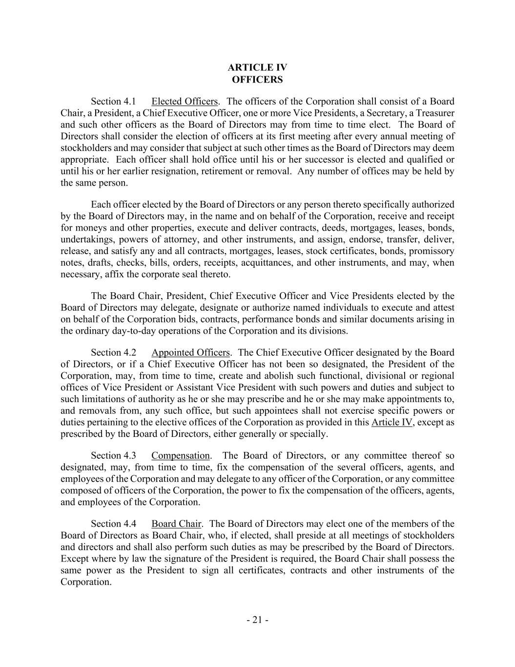 - 21 - ARTICLE IV OFFICERS Section 4.1 Elected Officers. The officers of the Corporation shall consist of a Board Chair, a President, a Chief Executive Officer, one or more Vice Presidents, a Secretary, a Treasurer and such other officers as the Board of Directors may from time to time elect. The Board of Directors shall consider the election of officers at its first meeting after every annual meeting of stockholders and may consider that subject at such other times as the Board of Directors may deem appropriate. Each officer shall hold office until his or her successor is elected and qualified or until his or her earlier resignation, retirement or removal. Any number of offices may be held by the same person. Each officer elected by the Board of Directors or any person thereto specifically authorized by the Board of Directors may, in the name and on behalf of the Corporation, receive and receipt for moneys and other properties, execute and deliver contracts, deeds, mortgages, leases, bonds, undertakings, powers of attorney, and other instruments, and assign, endorse, transfer, deliver, release, and satisfy any and all contracts, mortgages, leases, stock certificates, bonds, promissory notes, drafts, checks, bills, orders, receipts, acquittances, and other instruments, and may, when necessary, affix the corporate seal thereto. The Board Chair, President, Chief Executive Officer and Vice Presidents elected by the Board of Directors may delegate, designate or authorize named individuals to execute and attest on behalf of the Corporation bids, contracts, performance bonds and similar documents arising in the ordinary day-to-day operations of the Corporation and its divisions. Section 4.2 Appointed Officers. The Chief Executive Officer designated by the Board of Directors, or if a Chief Executive Officer has not been so designated, the President of the Corporation, may, from time to time, create and abolish such functional, divisional or regional offices of Vice President or Assistant Vice President with such powers and duties and subject to such limitations of authority as he or she may prescribe and he or she may make appointments to, and removals from, any such office, but such appointees shall not exercise specific powers or duties pertaining to the elective offices of the Corporation as provided in this Article IV, except as prescribed by the Board of Directors, either generally or specially. Section 4.3 Compensation. The Board of Directors, or any committee thereof so designated, may, from time to time, fix the compensation of the several officers, agents, and employees of the Corporation and may delegate to any officer of the Corporation, or any committee composed of officers of the Corporation, the power to fix the compensation of the officers, agents, and employees of the Corporation. Section 4.4 Board Chair. The Board of Directors may elect one of the members of the Board of Directors as Board Chair, who, if elected, shall preside at all meetings of stockholders and directors and shall also perform such duties as may be prescribed by the Board of Directors. Except where by law the signature of the President is required, the Board Chair shall possess the same power as the President to sign all certificates, contracts and other instruments of the Corporation.