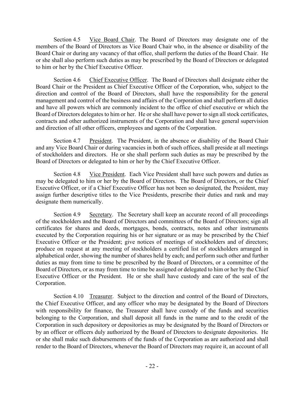 - 22 - Section 4.5 Vice Board Chair. The Board of Directors may designate one of the members of the Board of Directors as Vice Board Chair who, in the absence or disability of the Board Chair or during any vacancy of that office, shall perform the duties of the Board Chair. He or she shall also perform such duties as may be prescribed by the Board of Directors or delegated to him or her by the Chief Executive Officer. Section 4.6 Chief Executive Officer. The Board of Directors shall designate either the Board Chair or the President as Chief Executive Officer of the Corporation, who, subject to the direction and control of the Board of Directors, shall have the responsibility for the general management and control of the business and affairs of the Corporation and shall perform all duties and have all powers which are commonly incident to the office of chief executive or which the Board of Directors delegates to him or her. He or she shall have power to sign all stock certificates, contracts and other authorized instruments of the Corporation and shall have general supervision and direction of all other officers, employees and agents of the Corporation. Section 4.7 President. The President, in the absence or disability of the Board Chair and any Vice Board Chair or during vacancies in both of such offices, shall preside at all meetings of stockholders and directors. He or she shall perform such duties as may be prescribed by the Board of Directors or delegated to him or her by the Chief Executive Officer. Section 4.8 Vice President. Each Vice President shall have such powers and duties as may be delegated to him or her by the Board of Directors. The Board of Directors, or the Chief Executive Officer, or if a Chief Executive Officer has not been so designated, the President, may assign further descriptive titles to the Vice Presidents, prescribe their duties and rank and may designate them numerically. Section 4.9 Secretary. The Secretary shall keep an accurate record of all proceedings of the stockholders and the Board of Directors and committees of the Board of Directors; sign all certificates for shares and deeds, mortgages, bonds, contracts, notes and other instruments executed by the Corporation requiring his or her signature or as may be prescribed by the Chief Executive Officer or the President; give notices of meetings of stockholders and of directors; produce on request at any meeting of stockholders a certified list of stockholders arranged in alphabetical order, showing the number of shares held by each; and perform such other and further duties as may from time to time be prescribed by the Board of Directors, or a committee of the Board of Directors, or as may from time to time be assigned or delegated to him or her by the Chief Executive Officer or the President. He or she shall have custody and care of the seal of the Corporation. Section 4.10 Treasurer. Subject to the direction and control of the Board of Directors, the Chief Executive Officer, and any officer who may be designated by the Board of Directors with responsibility for finance, the Treasurer shall have custody of the funds and securities belonging to the Corporation, and shall deposit all funds in the name and to the credit of the Corporation in such depository or depositories as may be designated by the Board of Directors or by an officer or officers duly authorized by the Board of Directors to designate depositories. He or she shall make such disbursements of the funds of the Corporation as are authorized and shall render to the Board of Directors, whenever the Board of Directors may require it, an account of all