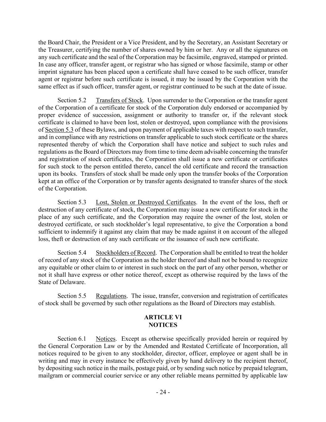 - 24 - the Board Chair, the President or a Vice President, and by the Secretary, an Assistant Secretary or the Treasurer, certifying the number of shares owned by him or her. Any or all the signatures on any such certificate and the seal of the Corporation may be facsimile, engraved, stamped or printed. In case any officer, transfer agent, or registrar who has signed or whose facsimile, stamp or other imprint signature has been placed upon a certificate shall have ceased to be such officer, transfer agent or registrar before such certificate is issued, it may be issued by the Corporation with the same effect as if such officer, transfer agent, or registrar continued to be such at the date of issue. Section 5.2 Transfers of Stock. Upon surrender to the Corporation or the transfer agent of the Corporation of a certificate for stock of the Corporation duly endorsed or accompanied by proper evidence of succession, assignment or authority to transfer or, if the relevant stock certificate is claimed to have been lost, stolen or destroyed, upon compliance with the provisions of Section 5.3 of these Bylaws, and upon payment of applicable taxes with respect to such transfer, and in compliance with any restrictions on transfer applicable to such stock certificate or the shares represented thereby of which the Corporation shall have notice and subject to such rules and regulations as the Board of Directors may from time to time deem advisable concerning the transfer and registration of stock certificates, the Corporation shall issue a new certificate or certificates for such stock to the person entitled thereto, cancel the old certificate and record the transaction upon its books. Transfers of stock shall be made only upon the transfer books of the Corporation kept at an office of the Corporation or by transfer agents designated to transfer shares of the stock of the Corporation. Section 5.3 Lost, Stolen or Destroyed Certificates. In the event of the loss, theft or destruction of any certificate of stock, the Corporation may issue a new certificate for stock in the place of any such certificate, and the Corporation may require the owner of the lost, stolen or destroyed certificate, or such stockholder’s legal representative, to give the Corporation a bond sufficient to indemnify it against any claim that may be made against it on account of the alleged loss, theft or destruction of any such certificate or the issuance of such new certificate. Section 5.4 Stockholders of Record. The Corporation shall be entitled to treat the holder of record of any stock of the Corporation as the holder thereof and shall not be bound to recognize any equitable or other claim to or interest in such stock on the part of any other person, whether or not it shall have express or other notice thereof, except as otherwise required by the laws of the State of Delaware. Section 5.5 Regulations. The issue, transfer, conversion and registration of certificates of stock shall be governed by such other regulations as the Board of Directors may establish. ARTICLE VI NOTICES Section 6.1 Notices. Except as otherwise specifically provided herein or required by the General Corporation Law or by the Amended and Restated Certificate of Incorporation, all notices required to be given to any stockholder, director, officer, employee or agent shall be in writing and may in every instance be effectively given by hand delivery to the recipient thereof, by depositing such notice in the mails, postage paid, or by sending such notice by prepaid telegram, mailgram or commercial courier service or any other reliable means permitted by applicable law
