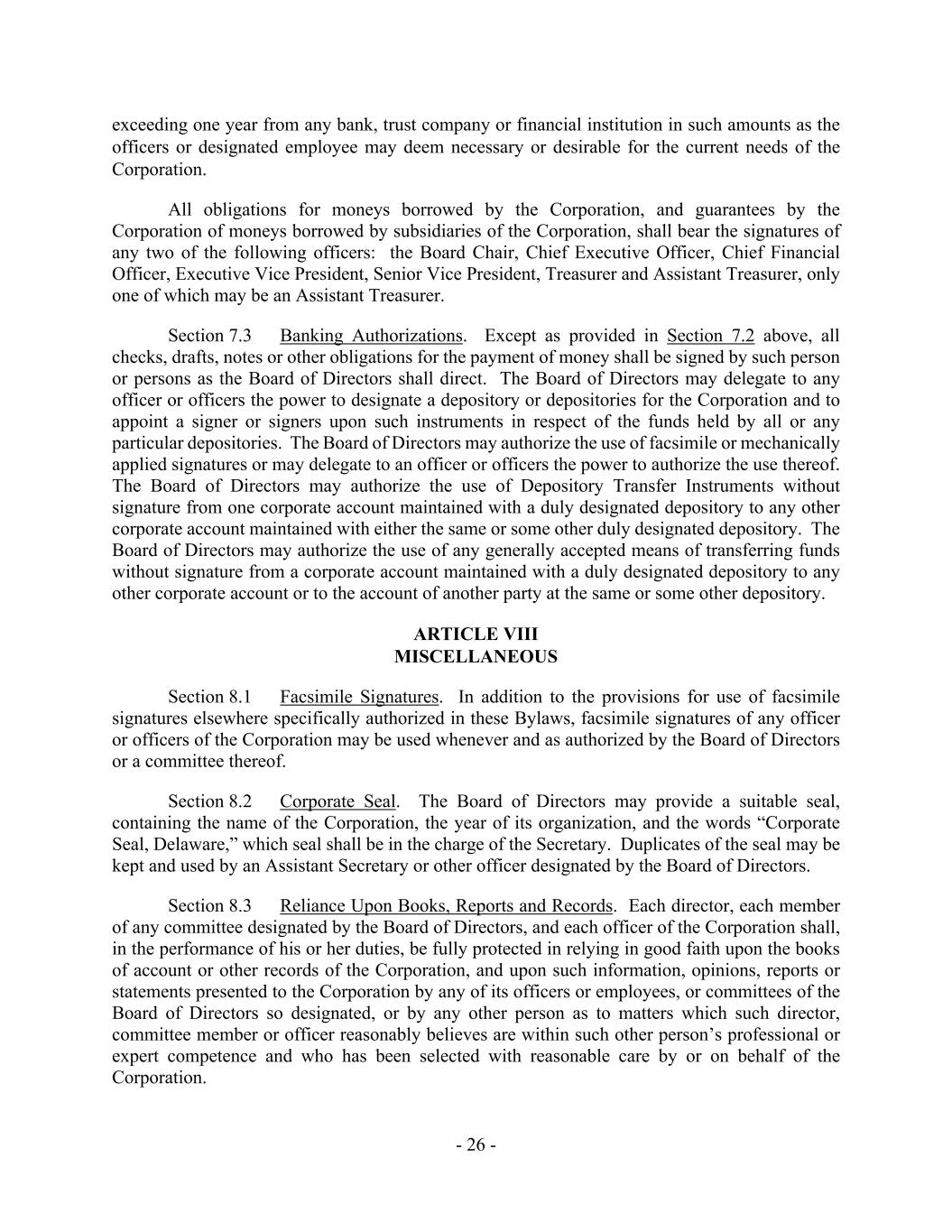 - 26 - exceeding one year from any bank, trust company or financial institution in such amounts as the officers or designated employee may deem necessary or desirable for the current needs of the Corporation. All obligations for moneys borrowed by the Corporation, and guarantees by the Corporation of moneys borrowed by subsidiaries of the Corporation, shall bear the signatures of any two of the following officers: the Board Chair, Chief Executive Officer, Chief Financial Officer, Executive Vice President, Senior Vice President, Treasurer and Assistant Treasurer, only one of which may be an Assistant Treasurer. Section 7.3 Banking Authorizations. Except as provided in Section 7.2 above, all checks, drafts, notes or other obligations for the payment of money shall be signed by such person or persons as the Board of Directors shall direct. The Board of Directors may delegate to any officer or officers the power to designate a depository or depositories for the Corporation and to appoint a signer or signers upon such instruments in respect of the funds held by all or any particular depositories. The Board of Directors may authorize the use of facsimile or mechanically applied signatures or may delegate to an officer or officers the power to authorize the use thereof. The Board of Directors may authorize the use of Depository Transfer Instruments without signature from one corporate account maintained with a duly designated depository to any other corporate account maintained with either the same or some other duly designated depository. The Board of Directors may authorize the use of any generally accepted means of transferring funds without signature from a corporate account maintained with a duly designated depository to any other corporate account or to the account of another party at the same or some other depository. ARTICLE VIII MISCELLANEOUS Section 8.1 Facsimile Signatures. In addition to the provisions for use of facsimile signatures elsewhere specifically authorized in these Bylaws, facsimile signatures of any officer or officers of the Corporation may be used whenever and as authorized by the Board of Directors or a committee thereof. Section 8.2 Corporate Seal. The Board of Directors may provide a suitable seal, containing the name of the Corporation, the year of its organization, and the words “Corporate Seal, Delaware,” which seal shall be in the charge of the Secretary. Duplicates of the seal may be kept and used by an Assistant Secretary or other officer designated by the Board of Directors. Section 8.3 Reliance Upon Books, Reports and Records. Each director, each member of any committee designated by the Board of Directors, and each officer of the Corporation shall, in the performance of his or her duties, be fully protected in relying in good faith upon the books of account or other records of the Corporation, and upon such information, opinions, reports or statements presented to the Corporation by any of its officers or employees, or committees of the Board of Directors so designated, or by any other person as to matters which such director, committee member or officer reasonably believes are within such other person’s professional or expert competence and who has been selected with reasonable care by or on behalf of the Corporation.