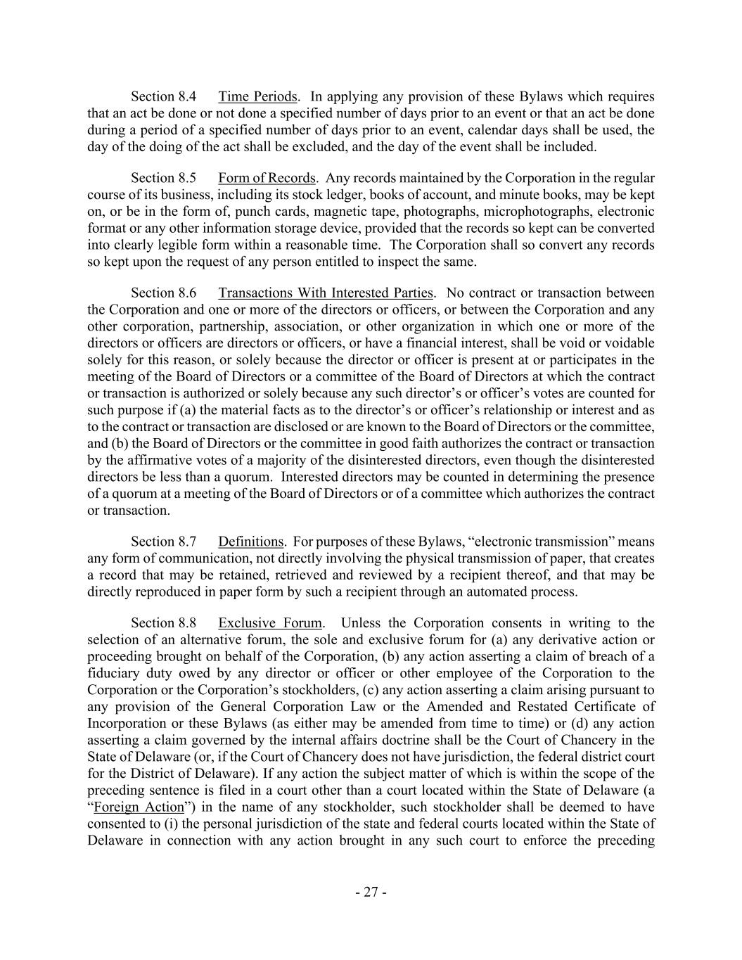 - 27 - Section 8.4 Time Periods. In applying any provision of these Bylaws which requires that an act be done or not done a specified number of days prior to an event or that an act be done during a period of a specified number of days prior to an event, calendar days shall be used, the day of the doing of the act shall be excluded, and the day of the event shall be included. Section 8.5 Form of Records. Any records maintained by the Corporation in the regular course of its business, including its stock ledger, books of account, and minute books, may be kept on, or be in the form of, punch cards, magnetic tape, photographs, microphotographs, electronic format or any other information storage device, provided that the records so kept can be converted into clearly legible form within a reasonable time. The Corporation shall so convert any records so kept upon the request of any person entitled to inspect the same. Section 8.6 Transactions With Interested Parties. No contract or transaction between the Corporation and one or more of the directors or officers, or between the Corporation and any other corporation, partnership, association, or other organization in which one or more of the directors or officers are directors or officers, or have a financial interest, shall be void or voidable solely for this reason, or solely because the director or officer is present at or participates in the meeting of the Board of Directors or a committee of the Board of Directors at which the contract or transaction is authorized or solely because any such director’s or officer’s votes are counted for such purpose if (a) the material facts as to the director’s or officer’s relationship or interest and as to the contract or transaction are disclosed or are known to the Board of Directors or the committee, and (b) the Board of Directors or the committee in good faith authorizes the contract or transaction by the affirmative votes of a majority of the disinterested directors, even though the disinterested directors be less than a quorum. Interested directors may be counted in determining the presence of a quorum at a meeting of the Board of Directors or of a committee which authorizes the contract or transaction. Section 8.7 Definitions. For purposes of these Bylaws, “electronic transmission” means any form of communication, not directly involving the physical transmission of paper, that creates a record that may be retained, retrieved and reviewed by a recipient thereof, and that may be directly reproduced in paper form by such a recipient through an automated process. Section 8.8 Exclusive Forum. Unless the Corporation consents in writing to the selection of an alternative forum, the sole and exclusive forum for (a) any derivative action or proceeding brought on behalf of the Corporation, (b) any action asserting a claim of breach of a fiduciary duty owed by any director or officer or other employee of the Corporation to the Corporation or the Corporation’s stockholders, (c) any action asserting a claim arising pursuant to any provision of the General Corporation Law or the Amended and Restated Certificate of Incorporation or these Bylaws (as either may be amended from time to time) or (d) any action asserting a claim governed by the internal affairs doctrine shall be the Court of Chancery in the State of Delaware (or, if the Court of Chancery does not have jurisdiction, the federal district court for the District of Delaware). If any action the subject matter of which is within the scope of the preceding sentence is filed in a court other than a court located within the State of Delaware (a “Foreign Action”) in the name of any stockholder, such stockholder shall be deemed to have consented to (i) the personal jurisdiction of the state and federal courts located within the State of Delaware in connection with any action brought in any such court to enforce the preceding