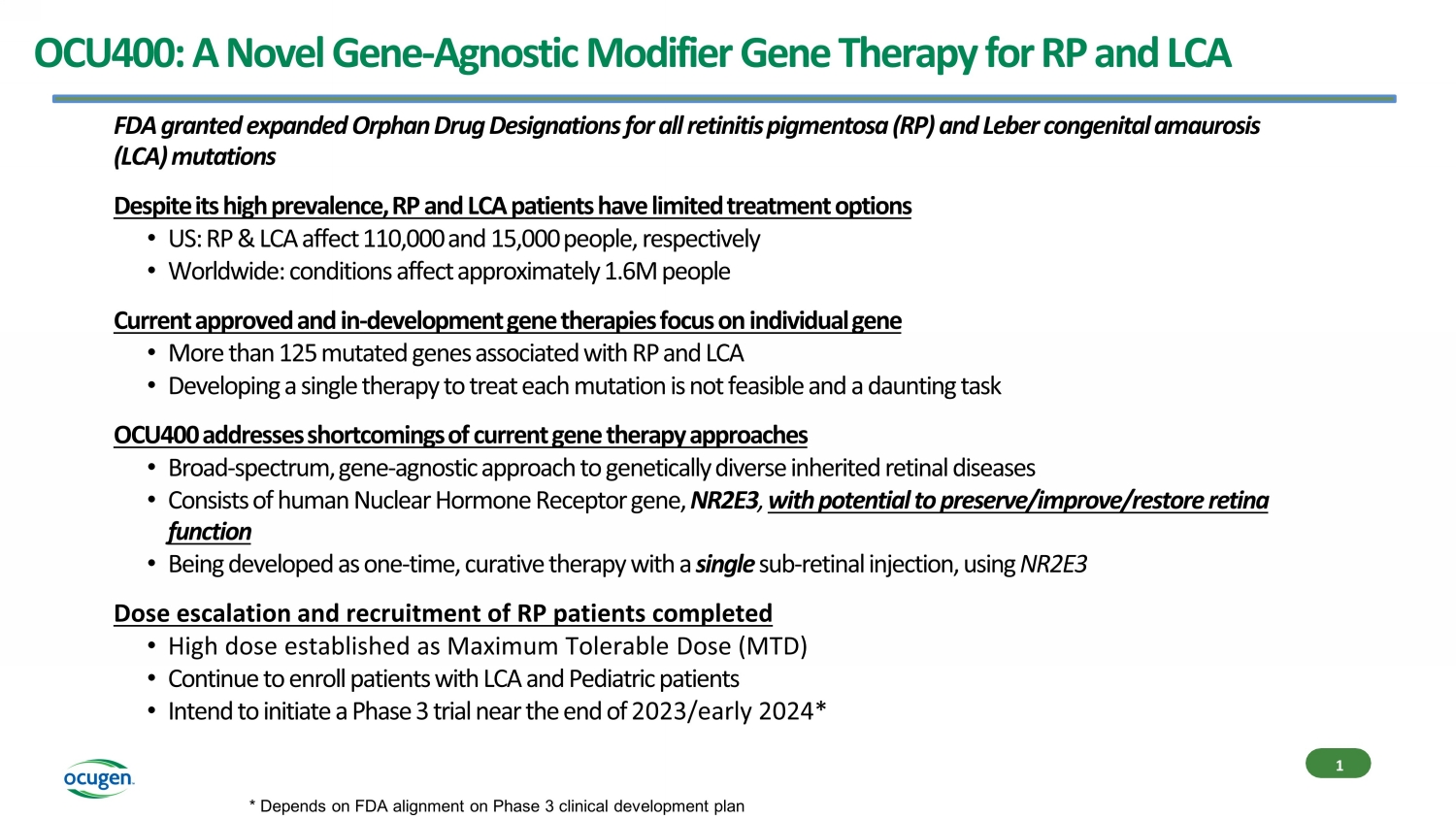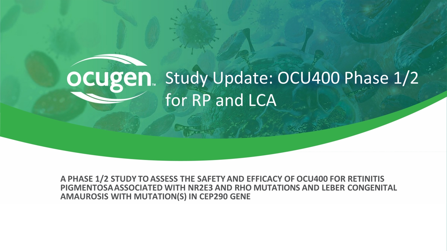 Study Update: OCU400 Phase 1/2 for RP and LCA A PHASE 1/2 STUDY TO ASSESS THE SAFETY AND EFFICACY OF OCU400 FOR RETINITIS PIGMENTOSA ASSOCIATED WITH NR2E3 AND RHO MUTATIONS AND LEBER CONGENITAL AMAUROSIS WITH MUTATION(S) IN CEP290 GENE
