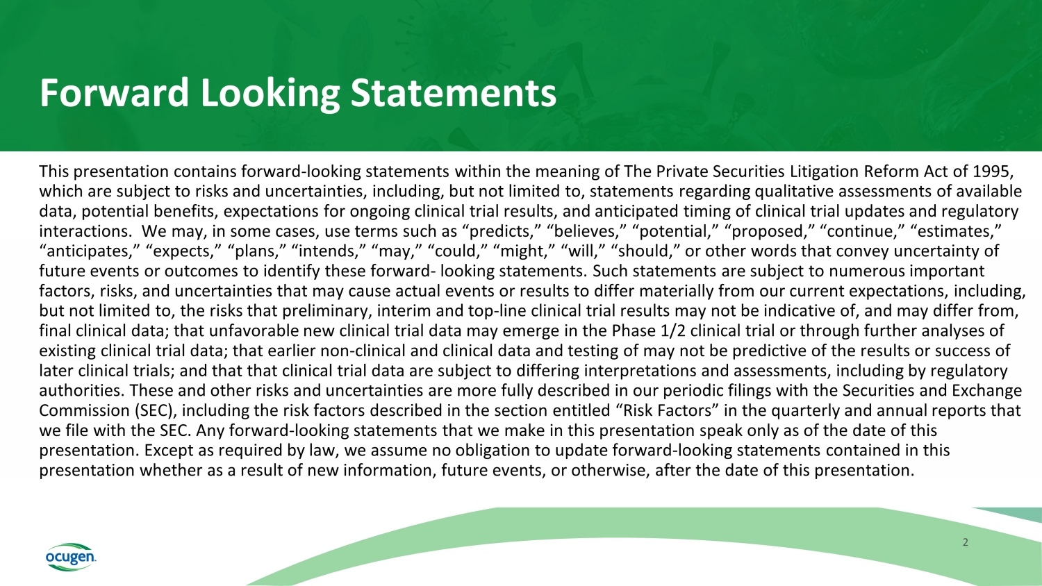 OCU400: A Novel Gene - Agnostic Modifier Gene Therapy for RP and LCA FDA granted expanded Orphan Drug Designations for all retinitis pigmentosa (RP) and Leber congenital amaurosis (LCA) mutations Despite its high prevalence, RP and LCA patients have limited treatment options • US: RP & LCA affect 110,000 and 15,000 people, respectively • Worldwide: conditions affect approximately 1.6M people Current approved and in - development gene therapies focus on individual gene • More than 125 mutated genes associated with RP and LCA • Developing a single therapy to treat each mutation is not feasible and a daunting task OCU400 addresses shortcomings of current gene therapy approaches • Broad - spectrum, gene - agnostic approach to genetically diverse inherited retinal diseases • Consists of human Nuclear Hormone Receptor gene, NR2E3 , with potential to preserve/improve/restore retina function • Being developed as one - time, curative therapy with a single sub - retinal injection, using NR2E3 Dose escalation and recruitment of RP patients completed • High dose established as Maximum Tolerable Dose (MTD) • Continue to enroll patients with LCA and Pediatric patients • Intend to initiate a Phase 3 trial near the end of 2023/early 2024* * Depends on FDA alignment on Phase 3 clinical development plan 1