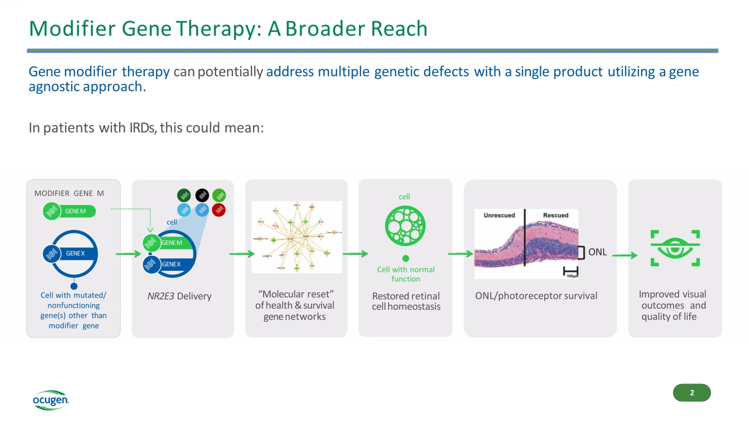 Modifier Gene Therapy: A Broader Reach Gene modifier therapy can potentially address multiple genetic defects with a single product utilizing a gene agnostic approach. In patients with IRDs, this could mean: Improved visual outcomes and quality of life GENE X GENE M cell NR2E3 Delivery “Molecular reset” of health & survival gene networks cell Cell with normal function Restored retinal cell homeostasis ONL ONL/photoreceptor survival GENE X Cell with mutated/ nonfunctioning gene(s) other than modifier gene MODIFIER GENE M GENE M 2