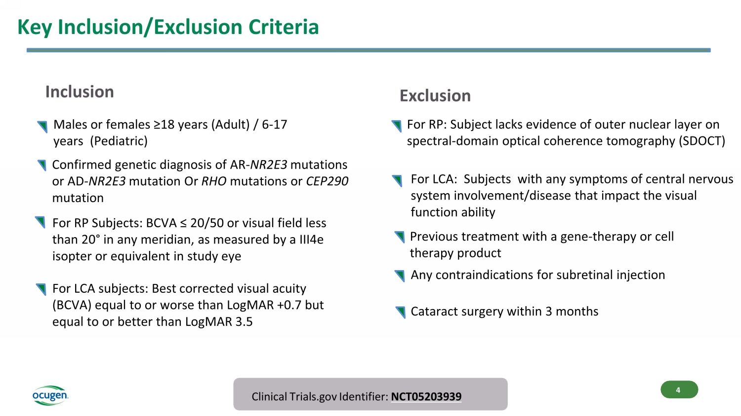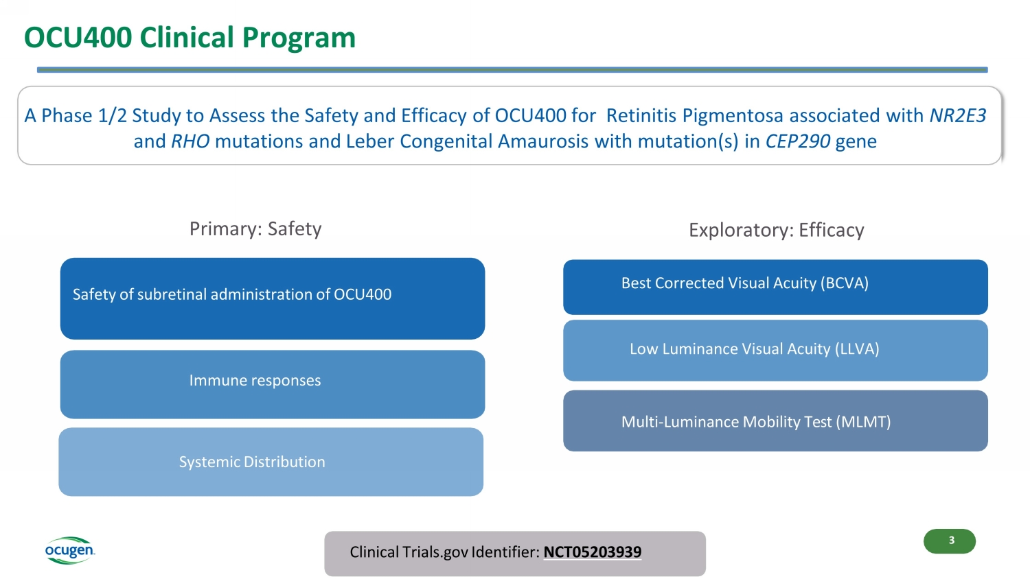 OCU400 Clinical Program A Phase 1/2 Study to Assess the Safety and Efficacy of OCU400 for Retinitis Pigmentosa associated with NR2E3 and RHO mutations and Leber Congenital Amaurosis with mutation(s) in CEP290 gene Clinical Trials.gov Identifier: NCT05203939 Safety of subretinal administration of OCU400 Immune responses Systemic Distribution Best Corrected Visual Acuity (BCVA) Multi - Luminance Mobility Test (MLMT) Low Luminance Visual Acuity (LLVA) Primary: Safety Exploratory: Efficacy 3