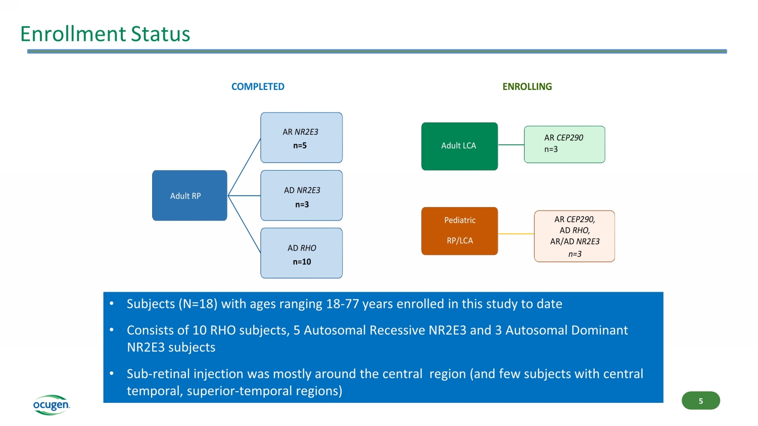 Key Inclusion/Exclusion Criteria Clinical Trials.gov Identifier: NCT05203939 For RP Subjects: BCVA ≤ 20/50 or visual field less than 20 ° in any meridian, as measured by a III4e isopter or equivalent in study eye Inclusion Exclusion 4 Confirmed genetic diagnosis of AR - NR2E3 mutations or AD - NR2E3 mutation Or RHO mutations or CEP290 mutation Males or females ≥18 years (Adult) / 6 - 17 years (Pediatric) For RP: Subject lacks evidence of outer nuclear layer on spectral - domain optical coherence tomography (SDOCT) Previous treatment with a gene - therapy or cell therapy product Any contraindications for subretinal injection Cataract surgery within 3 months For LCA subjects: Best corrected visual acuity (BCVA) equal to or worse than LogMAR +0.7 but equal to or better than LogMAR 3.5 For LCA: Subjects with any symptoms of central nervous system involvement/disease that impact the visual function ability
