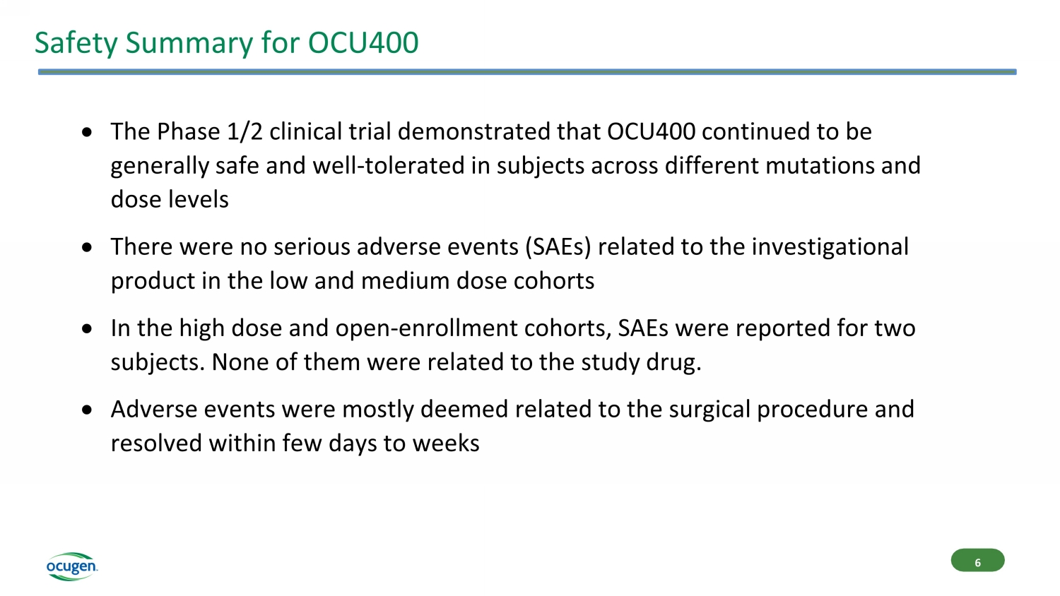 Safety Summary for OCU400 The Phase 1/2 clinical trial demonstrated that OCU400 continued to be generally safe and well - tolerated in subjects across different mutations and dose levels There were no serious adverse events (SAEs) related to the investigational product in the low and medium dose cohorts In the high dose and open - enrollment cohorts, SAEs were reported for two subjects. None of them were related to the study drug. Adverse events were mostly deemed related to the surgical procedure and resolved within few days to weeks 6