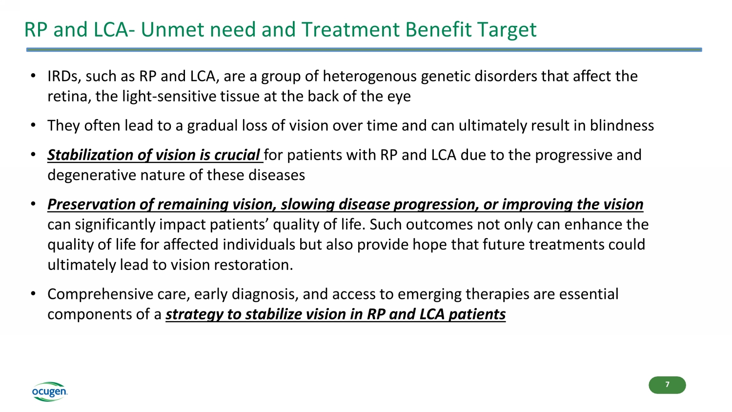 RP and LCA - Unmet need and Treatment Benefit Target 7 • IRDs, such as RP and LCA, are a group of heterogenous genetic disorders that affect the retina, the light - sensitive tissue at the back of the eye • They often lead to a gradual loss of vision over time and can ultimately result in blindness • Stabilization of vision is crucial for patients with RP and LCA due to the progressive and degenerative nature of these diseases • Preservation of remaining vision, slowing disease progression, or improving the vision can significantly impact patients’ quality of life. Such outcomes not only can enhance the quality of life for affected individuals but also provide hope that future treatments could ultimately lead to vision restoration. • Comprehensive care, early diagnosis, and access to emerging therapies are essential components of a strategy to stabilize vision in RP and LCA patients