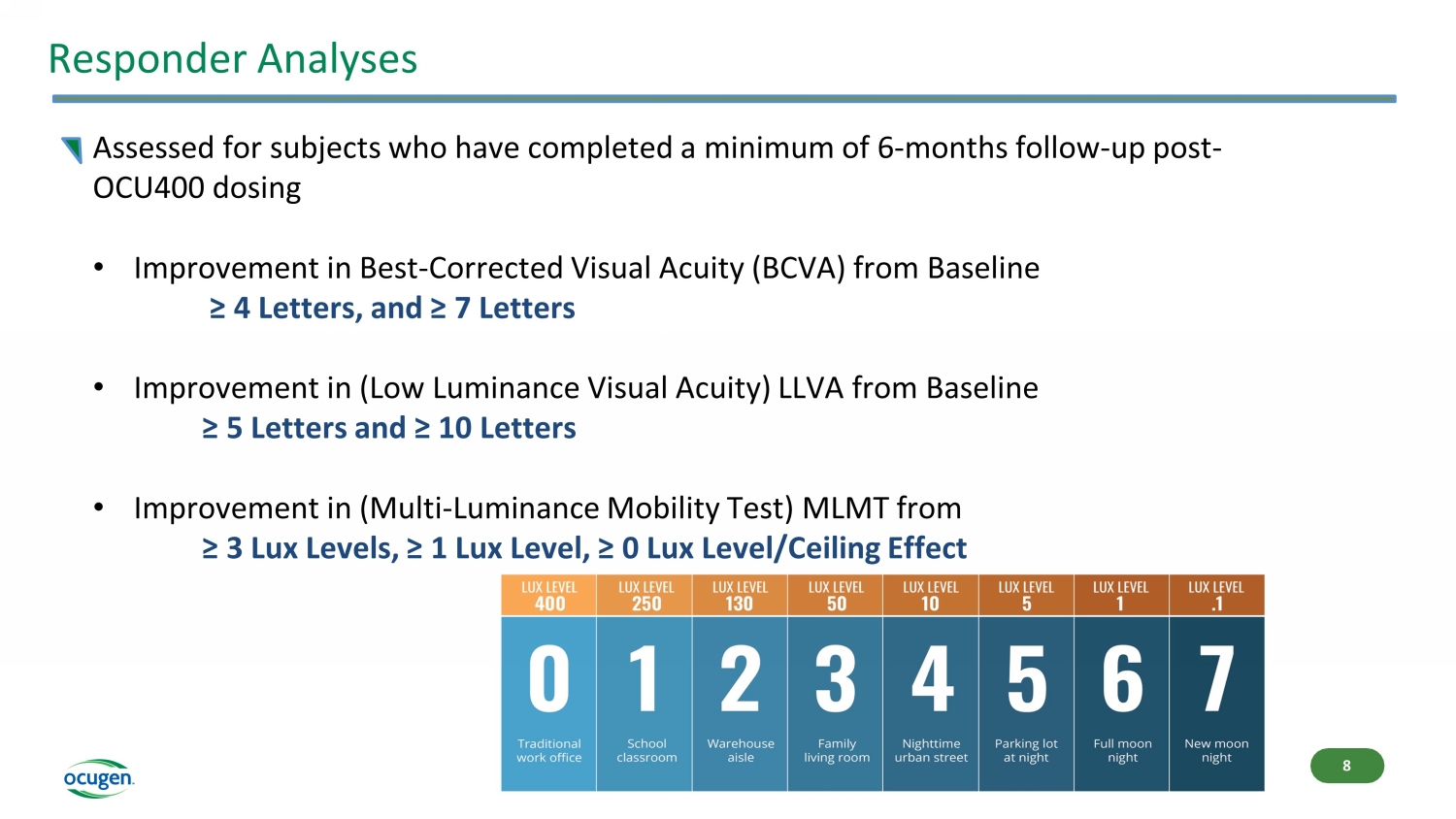 Responder Analyses Assessed for subjects who have completed a minimum of 6 - months follow - up post - OCU400 dosing • Improvement in Best - Corrected Visual Acuity (BCVA) from Baseline ≥ 4 Letters, and ≥ 7 Letters • Improvement in (Low Luminance Visual Acuity) LLVA from Baseline ≥ 5 Letters and ≥ 10 Letters • Improvement in (Multi - Luminance Mobility Test) MLMT from ≥ 3 Lux Levels, ≥ 1 Lux Level, ≥ 0 Lux Level/Ceiling Effect 8