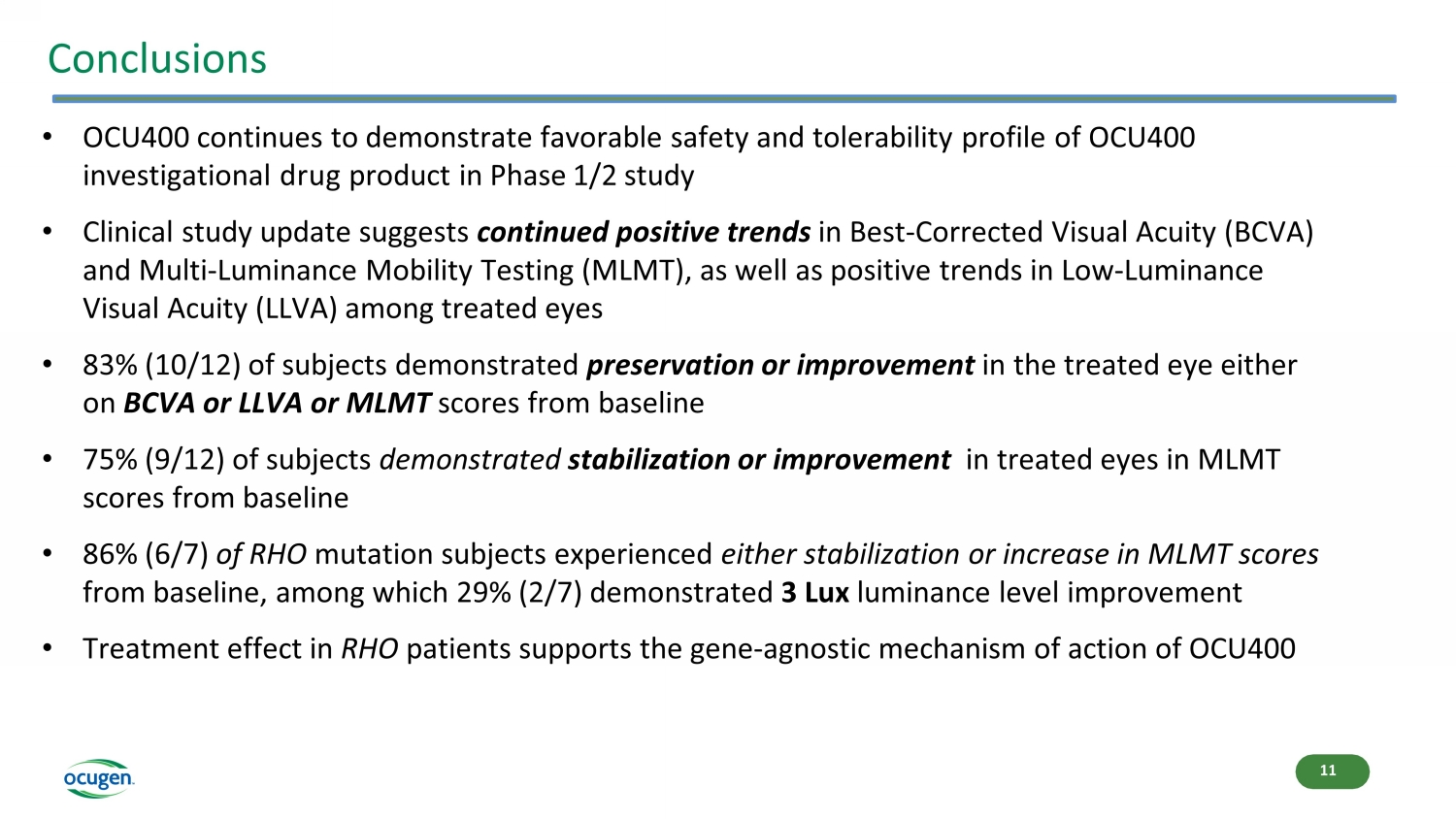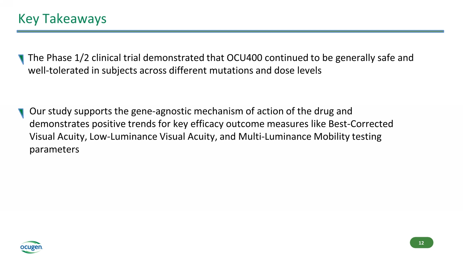 Key Takeaways The Phase 1/2 clinical trial demonstrated that OCU400 continued to be generally safe and well - tolerated in subjects across different mutations and dose levels Our study supports the gene - agnostic mechanism of action of the drug and demonstrates positive trends for key efficacy outcome measures like Best - Corrected Visual Acuity, Low - Luminance Visual Acuity, and Multi - Luminance Mobility testing parameters 12