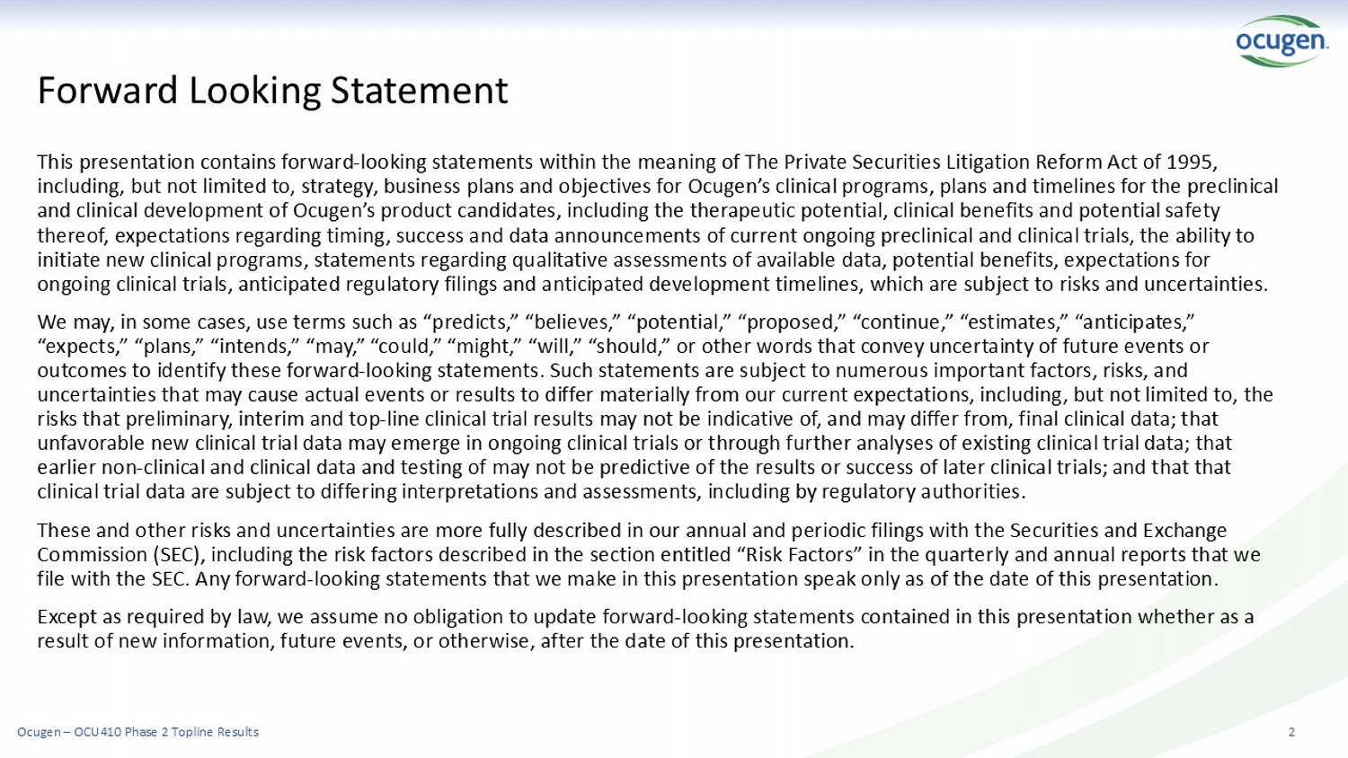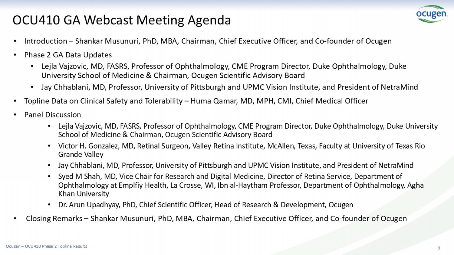 2 This presentation contains forward - looking statements within the meaning of The Private Securities Litigation Reform Act of 1995 , including, but not limited to, strategy, business plans and objectives for Ocugen’s clinical programs, plans and timelines fo r t he preclinical and clinical development of Ocugen’s product candidates, including the therapeutic potential, clinical benefits and potential sa fety thereof, expectations regarding timing, success and data announcements of current ongoing preclinical and clinical trials, th e a bility to initiate new clinical programs, statements regarding qualitative assessments of available data, potential benefits, expectati ons for ongoing clinical trials, anticipated regulatory filings and anticipated development timelines, which are subject to risks and un certainties. We may, in some cases, use terms such as “predicts,” “believes,” “potential,” “proposed,” “continue,” “estimates,” “anticipat es, ” “expects,” “plans,” “intends,” “may,” “could,” “might,” “will,” “should,” or other words that convey uncertainty of future ev ent s or outcomes to identify these forward - looking statements. Such statements are subject to numerous important factors, risks, and uncertainties that may cause actual events or results to differ materially from our current expectations, including, but not lim ited to, the risks that preliminary, interim and top - line clinical trial results may not be indicative of, and may differ from, final clinica l data; that unfavorable new clinical trial data may emerge in ongoing clinical trials or through further analyses of existing clinical tr ial data; that earlier non - clinical and clinical data and testing of may not be predictive of the results or success of later clinical trials; and that that clinical trial data are subject to differing interpretations and assessments, including by regulatory authorities. These and other risks and uncertainties are more fully described in our annual and periodic filings with the Securities and E xch ange Commission (SEC), including the risk factors described in the section entitled “Risk Factors” in the quarterly and annual rep ort s that we file with the SEC. Any forward - looking statements that we make in this presentation speak only as of the date of this presentati on. Except as required by law, we assume no obligation to update forward - looking statements contained in this presentation whether a s a result of new information, future events, or otherwise, after the date of this presentation. Forward Looking Statement Ocugen – OCU410 Phase 2 Topline Results