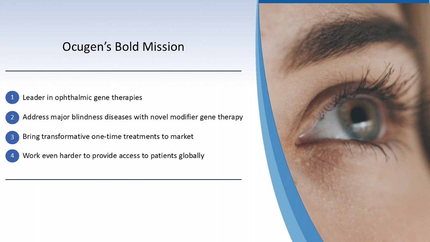 Ocugen’s Bold Mission Leader in ophthalmic gene therapies Address major blindness diseases with novel modifier gene therapy Bring transformative one - time treatments to market Work even harder to provide access to patients globally 1 2 3 4