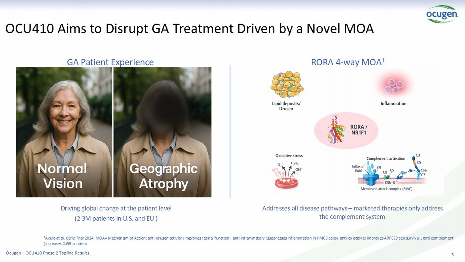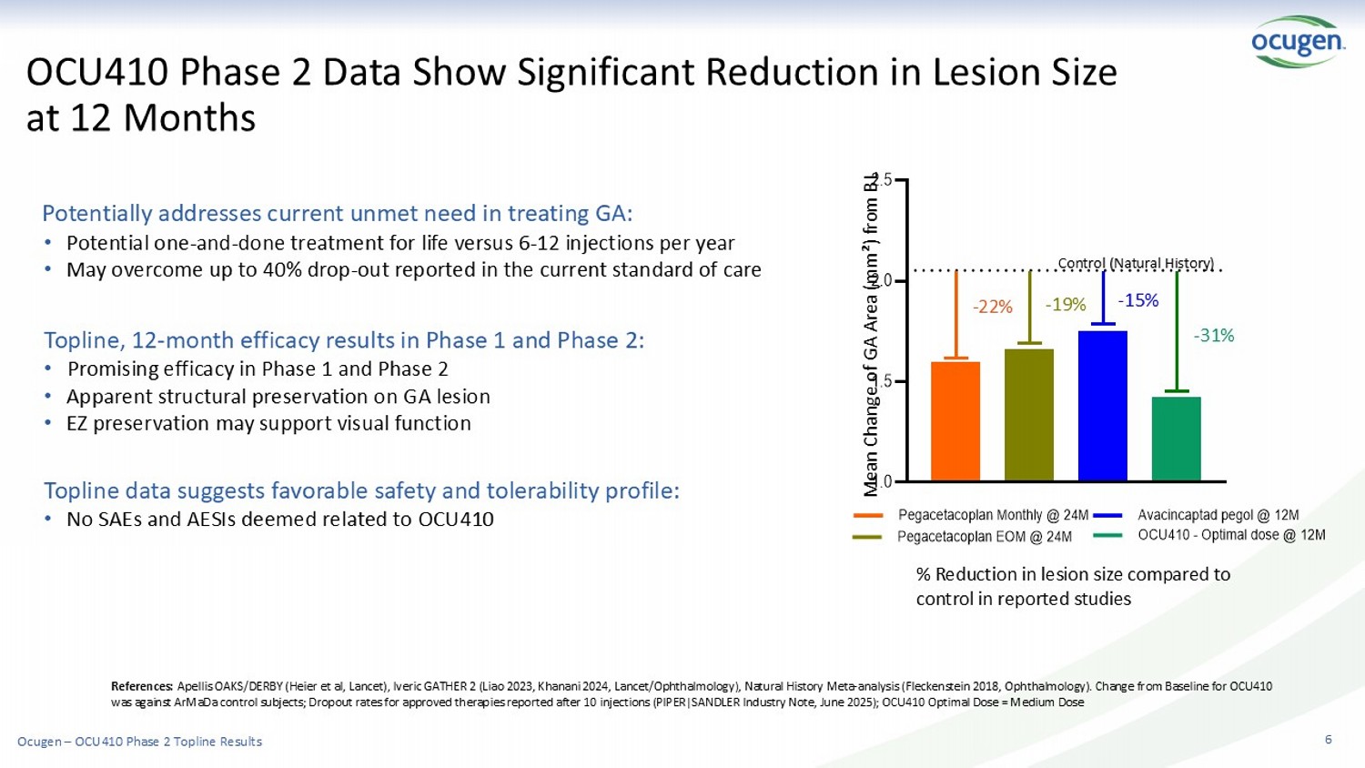 OCU410 Phase 2 Data Show Significant Reduction in Lesion Size at 12 Months References: Apellis OAKS/DERBY (Heier et al, Lancet), Iveric GATHER 2 (Liao 2023, Khanani 2024, Lancet/Ophthalmology), Natural History Meta - analysis (Fleckenstein 2018, Ophthalmology). Cha nge from Baseline for OCU410 was against ArMaDa control subjects; Dropout rates for approved therapies reported after 10 injections (PIPER|SANDLER Industry Note, June 2025); O CU410 Optimal Dose = Medium Dose Potentially addresses current unmet need in treating GA: • Potential one - and - done treatment for life versus 6 - 12 injections per year • May overcome up to 40% drop - out reported in the current standard of care Topline, 12 - month efficacy results in Phase 1 and Phase 2: • Promising efficacy in Phase 1 and Phase 2 • Apparent structural preservation on GA lesion • EZ preservation may support visual function Topline data suggests favorable safety and tolerability profile: • No SAEs and AESIs deemed related to OCU410 % Reduction in lesion size compared to control in reported studies 1.0 1.5 2.0 2.5 Pegacetacoplan Monthly @ 24M Pegacetacoplan EOM @ 24M Avacincaptad pegol @ 12M OCU410 - Optimal dose @ 12M Control (Natural History) - 22% - 19% - 15% - 31% Mean Change of GA Area (mm²) from BL Ocugen – OCU410 Phase 2 Topline Results 6