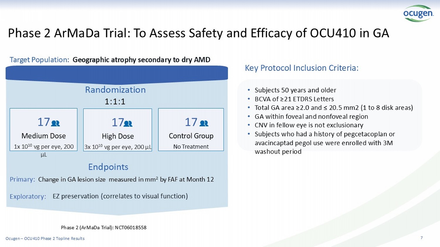 Courageous Innovation Topline Data for Phase 2 ArMaDa Trial A Study to Assess the Safety and Efficacy of OCU410 for Geographic Atrophy (late - stage dry AMD)