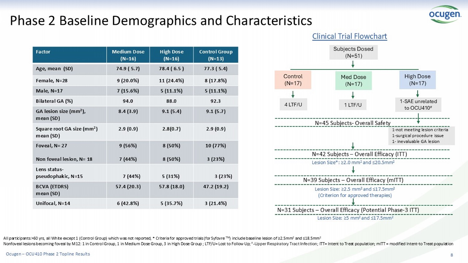 Endpoints Randomization 1:1:1 EZ preservation (correlates to visual function ) 17 Control Group No Treatment Primary: Exploratory: 17 Medium Dose 1x 10 10 vg per eye, 200 µL 17 High Dose 3x 10 10 vg per eye, 200 µL Phase 2 ArMaDa Trial: To Assess Safety and Efficacy of OCU410 in GA Target Population: Geographic atrophy secondary to dry AMD 7 • Subjects 50 years and older • BCVA of ≥21 ETDRS Letters • Total GA area ≥2.0 and ≤ 20.5 mm2 (1 to 8 disk areas) • GA within foveal and nonfoveal region • CNV in fellow eye is not exclusionary • Subjects who had a history of pegcetacoplan or avacincaptad pegol use were enrolled with 3M washout period Key Protocol Inclusion Criteria: Change in GA lesion size measured in mm 2 by FAF at Month 12 Phase 2 ( ArMaDa Trial): NCT06018558 Ocugen – OCU410 Phase 2 Topline Results