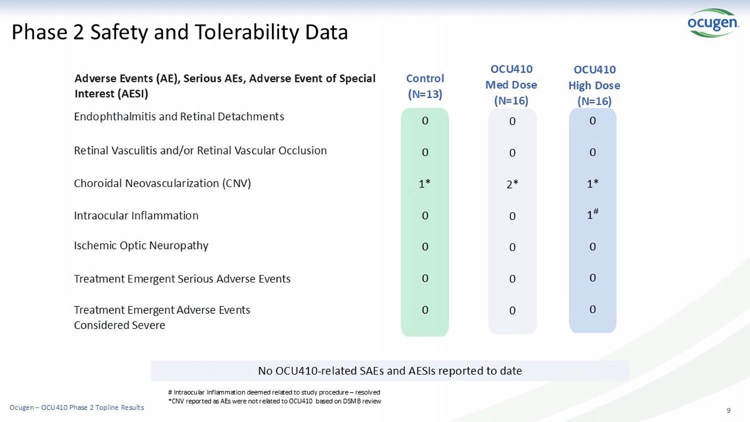 Phase 2 Baseline Demographics and Characteristics 8 All participants >60 yrs, all White except 1 (Control Group) which was not reported, * Criteria for approved trials (for Syfovre TM ) include baseline lesion of ≥2.5mm 2 and ≤18.5m m 2 Nonfoveal lesions becoming foveal by M12: 1 in Control Group, 1 in Medium Dose Group, 3 in High Dose Group ; LTF/U= Lost to Follow Up ; # - Upper Respiratory Tract Infection ; ITT= Intent to Treat population; mITT = modified Intent - to Treat population Control Group (N=13) High Dose (N=16) Medium Dose (N=16) Factor 77.3 ( 5.4) 78.4 ( 6.5 ) 74.9 ( 5.7) Age, mean (SD) 8 (17.8%) 11 (24.4%) 9 (20.0%) Female, N=28 5 (11.1%) 5 (11.1%) 7 (15.6%) Male, N=17 92.3 88.0 94.0 Bilateral GA (%) 9.1 (5.7) 9.1 (5.4) 8.4 (3.9) GA lesion size (mm 2 ), mean (SD) 2.9 (0.9) 2.8(0.7) 2.9 (0.9) Square root GA size (mm 2 ) mean (SD) 10 (77%) 3 (23%) 8 (50%) 8 (50%) 9 (56%) 7 (44%) Foveal, N= 27 Non foveal lesion, N= 18 3 (23%) 5 (31%) 7 (44%) Lens status - pseudophakic, N=15 47.2 (19.2) 57.8 (18.0) 57.4 (20.3) BCVA (ETDRS) mean (SD) 3 (21.4%) 5 (35.7%) 6 (42.8%) Unifocal, N=14 Ocugen – OCU410 Phase 2 Topline Results Subjects Dosed (N=51) Control (N=17) Med Dose (N=17) High Dose (N=17) 1 - SAE unrelated to OCU410 # 1 - not meeting lesion criteria 1 - surgical procedure issue 1 - inevaluable GA lesion 4 LTF/U 1 LTF/U N=45 Subjects - Overall Safety N=42 Subjects – Overall Efficacy (ITT) N=39 Subjects – Overall Efficacy ( mITT ) Lesion Size*: ≥2.0 mm 2 and ≤20.5mm 2 Lesion Size: ≥2.5 mm 2 and ≤17.5mm 2 (Criterion for approved therapies) N=31 Subjects – Overall Efficacy (Potential Phase - 3 ITT) Lesion Size: ≥5 mm 2 and ≤17.5mm 2 Clinical Trial Flowchart