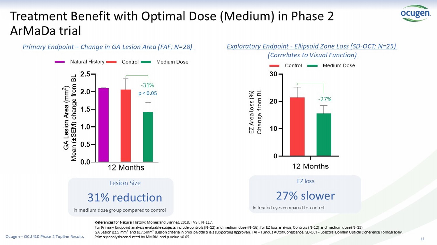 Lesion Size 31%, 16% reduction in medium, high dose group, respectively compared to control 10 OCU410 Provides Treatment Benefit at 12 Months For lesion criteria (≥2.5 mm 2 and ≤17.5mm 2 ) evaluable subjects (N=39)include controls (N=12), medium dose (N=16), and high dose (N=11) and for lesion criteria (≥5 mm 2 and ≤17.5mm 2, N=31 ) Controls (N= 9 ), medium dose (N=13) and high dose (N=9). References for Natural History: Mones and Biarnes, 2018, TVST, N=117 Lesion ≥5 mm 2 and ≤17.5mm 2 (N=31) Lesion Size 33%, 31% reduction in medium, high dose group, respectively compared to control Lesion ≥2.5 mm 2 and ≤17.5mm 2 (N=39) (Lesion criteria in pivotal trials supporting approval) 0.0 0.5 1.0 1.5 2.0 2.5 G A L e s i o n A r e a ( m m 2 ) M e a n ( ± S E M ) c h a n g e f r o m B L Control Medium Dose High Dose 12 Months Natural History - 16% - 31% 12 Months - 31% - 33% Ocugen – OCU410 Phase 2 Topline Results Lesion Size 18% reduction in treated eyes compared to controls Overall Analysis (N=42) ≥2.0 mm 2 and ≤20.5mm 2 Approved products: • Avacincaptad pegol at 12M (15%) • Pegcetacoplan EM at 24M (22%) 0.0 0.5 1.0 1.5 2.0 2.5 12 Months Control OCU410 - Overall Treated (Medium+High Dose) G A L e s i o n A r e a ( m m 2 ) M e a n ( ± S E M ) c h a n g e f r o m B L -18% 12 Months