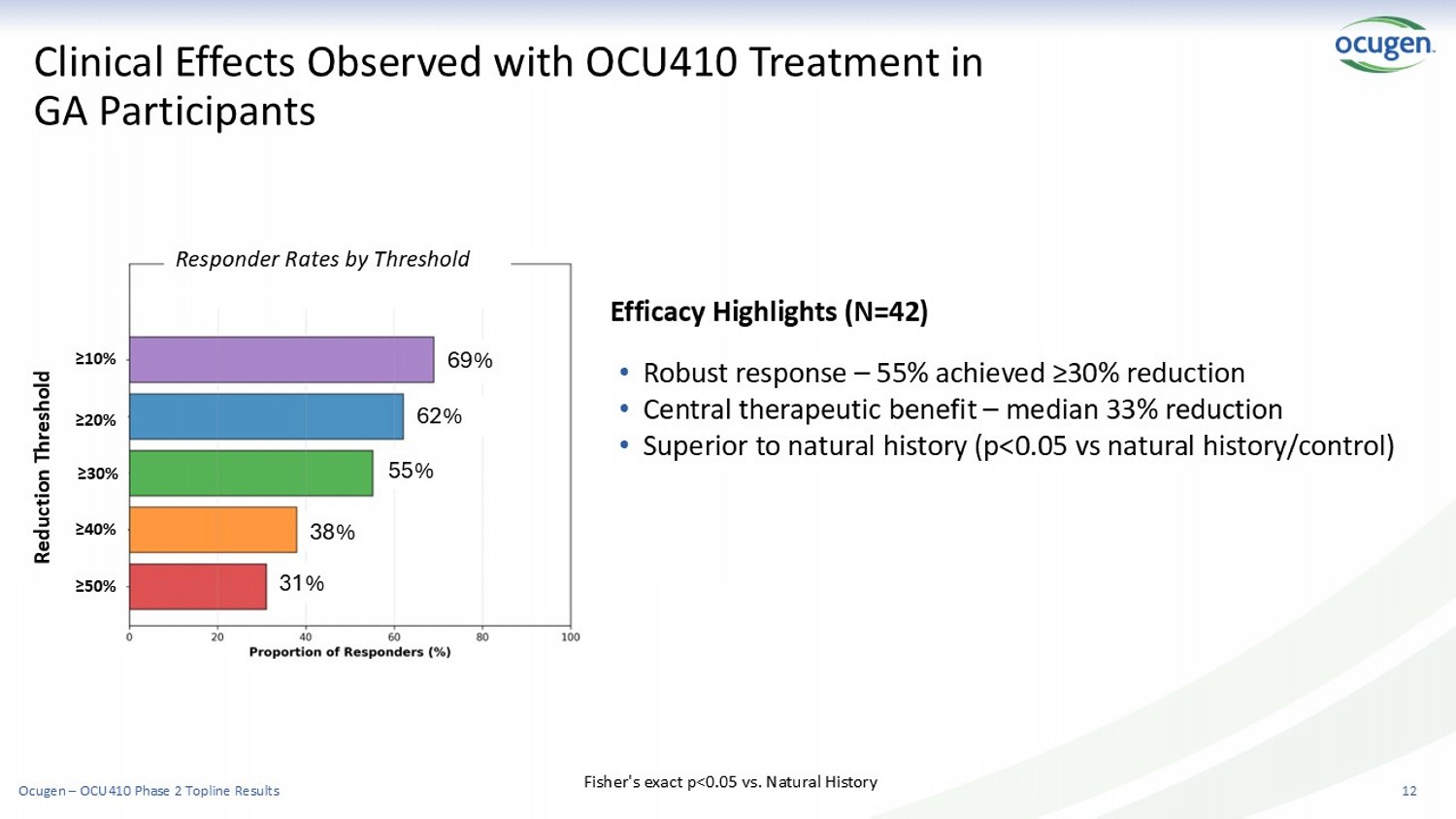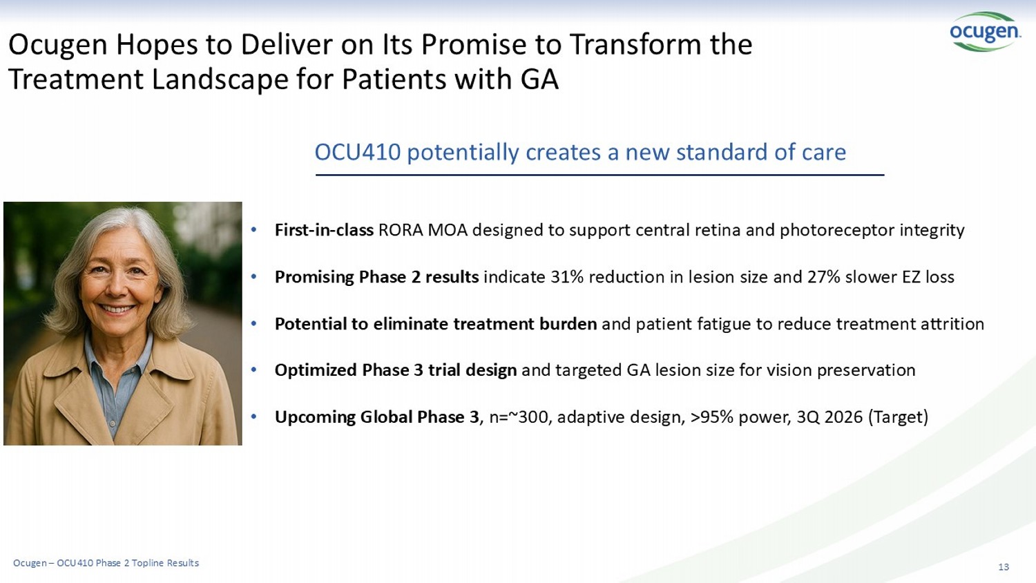 Clinical Effects Observed with OCU410 Treatment in GA Participants 12 Efficacy Highlights (N=42) • Robust response – 55% achieved ≥30% reduction • Central therapeutic benefit – median 33% reduction • Superior to natural history (p<0.05 vs natural history/control) Fisher's exact p<0.05 vs. Natural History Responder Rates by Threshold 69% 62% 55% 38% 31% 69% Reduction Threshold ≥10% ≥20% ≥30% ≥40% ≥50% Ocugen – OCU410 Phase 2 Topline Results