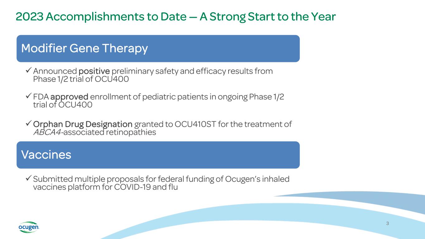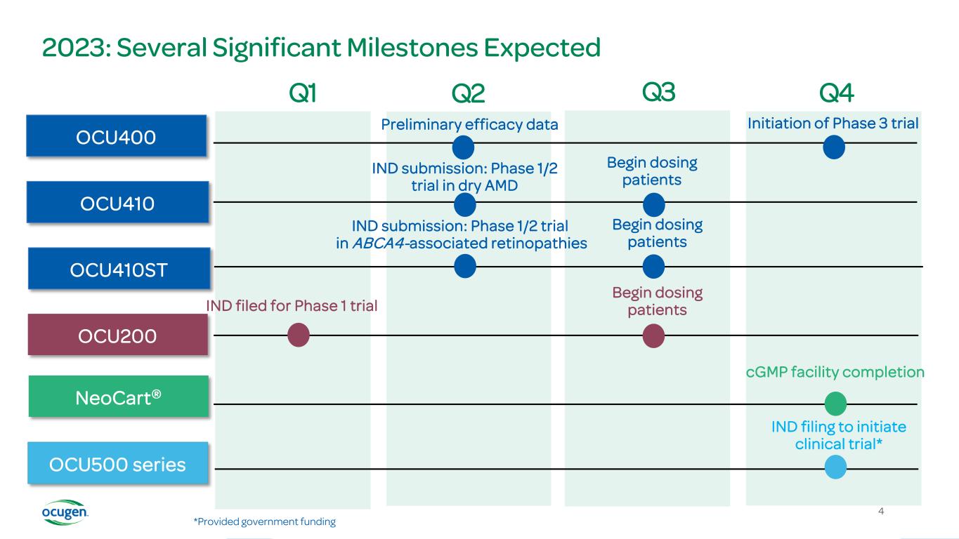 2023 Accomplishments to Date — A Strong Start to the Year Modifier Gene Therapy Announced positive preliminary safety and efficacy results from Phase 1/2 trial of OCU400 FDA approved enrollment of pediatric patients in ongoing Phase 1/2 trial of OCU400 Orphan Drug Designation granted to OCU410ST for the treatment of ABCA4-associated retinopathies Vaccines Submitted multiple proposals for federal funding of Ocugen’s inhaled vaccines platform for COVID-19 and flu 3