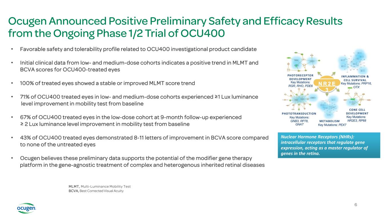 Ocugen Announced Positive Preliminary Safety and Efficacy Results from the Ongoing Phase 1/2 Trial of OCU400 • Favorable safety and tolerability profile related to OCU400 investigational product candidate • Initial clinical data from low- and medium-dose cohorts indicates a positive trend in MLMT and BCVA scores for OCU400-treated eyes • 100% of treated eyes showed a stable or improved MLMT score trend • 71% of OCU400 treated eyes in low- and medium-dose cohorts experienced ≥1 Lux luminance level improvement in mobility test from baseline • 67% of OCU400 treated eyes in the low-dose cohort at 9-month follow-up experienced ≥ 2 Lux luminance level improvement in mobility test from baseline • 43% of OCU400 treated eyes demonstrated 8-11 letters of improvement in BCVA score compared to none of the untreated eyes • Ocugen believes these preliminary data supports the potential of the modifier gene therapy platform in the gene-agnostic treatment of complex and heterogenous inherited retinal diseases MLMT, Multi-Luminance Mobility Test BCVA, Best Corrected Visual Acuity Nuclear Hormone Receptors (NHRs): intracellular receptors that regulate gene expression, acting as a master regulator of genes in the retina. 6