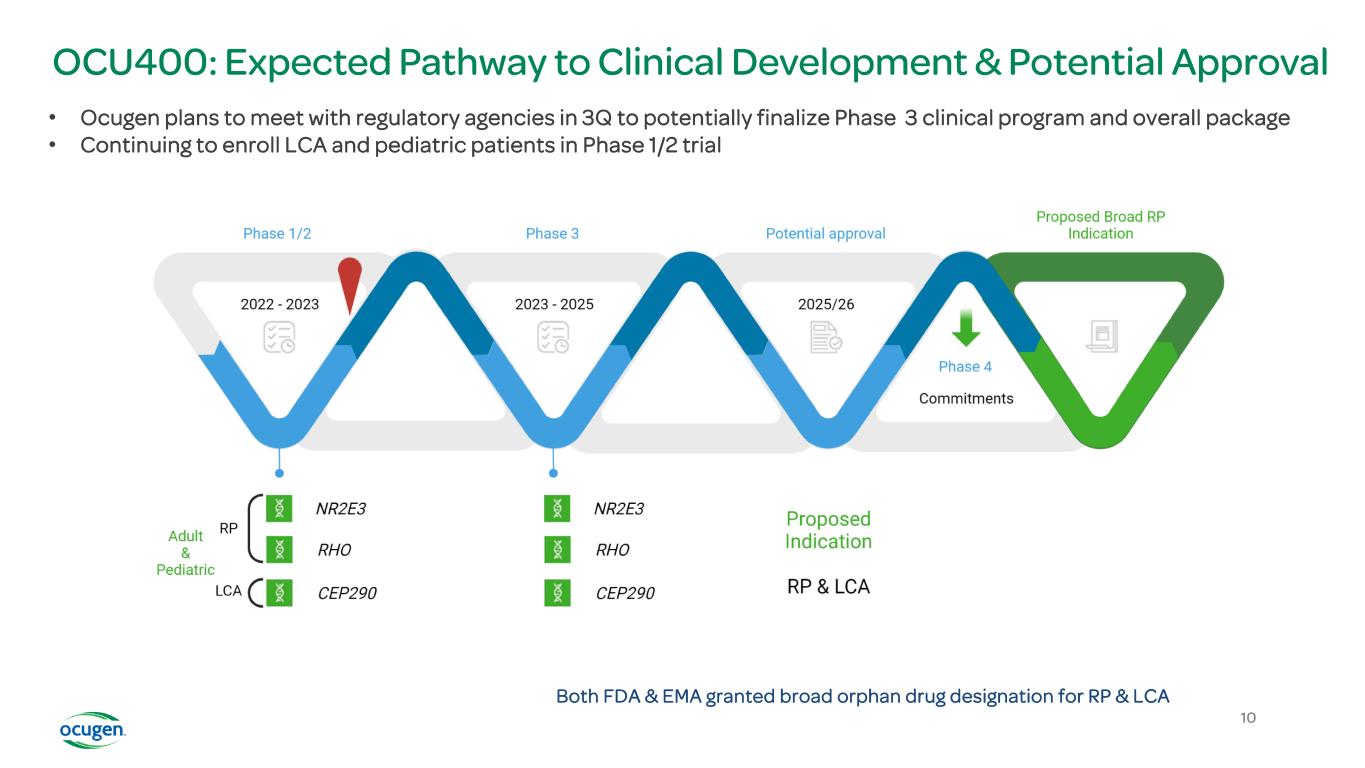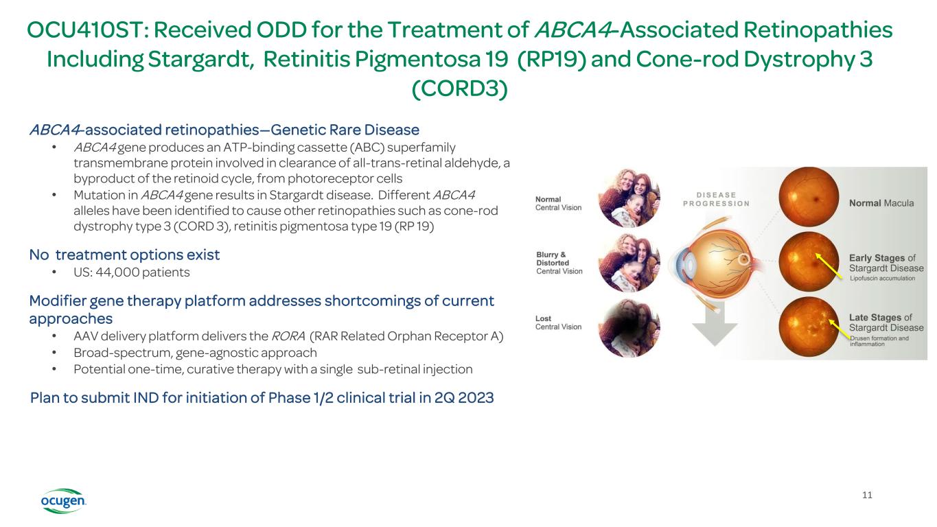 OCU400: Expected Pathway to Clinical Development & Potential Approval Both FDA & EMA granted broad orphan drug designation for RP & LCA • Ocugen plans to meet with regulatory agencies in 3Q to potentially finalize Phase 3 clinical program and overall package • Continuing to enroll LCA and pediatric patients in Phase 1/2 trial 10