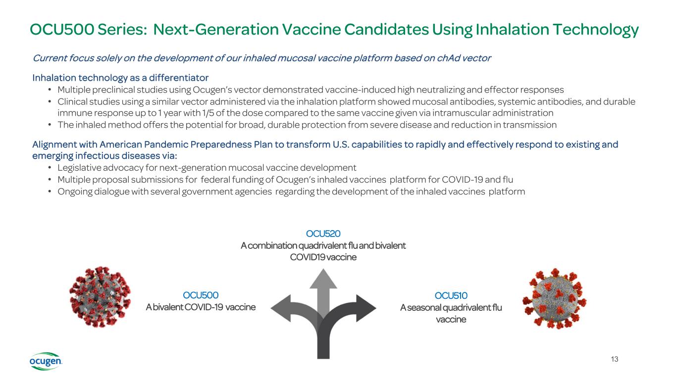 12 OCU410 for the Treatment of Dry Age-related Macular Degeneration (dAMD) dAMD Limited options, presenting significant unmet medical need • US: 10M • Worldwide: condition affects more than 266M people Recently approved therapy for geographic atrophy (GA)— advanced form of dAMD–has limitations • Frequent intravitreal injections (N ~6-12 doses per year); Patient compliance • Limited effect of GA lesion growth rate • Approximately 12% of patients experience neovascular AMD when the drug is administered every month for two years Plan to submit IND for initiation of Phase 1/2 clinical trial in 2Q 2023 Fatty Deposits