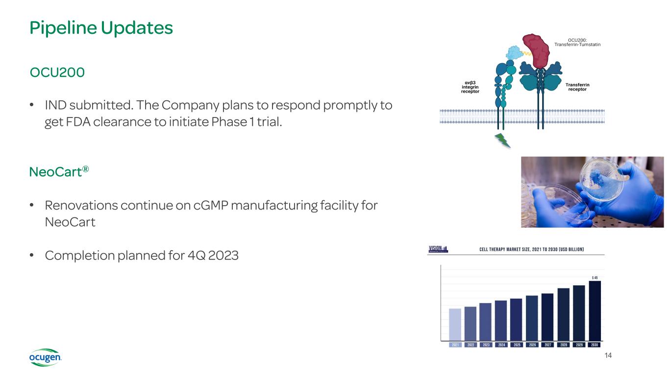 13 OCU500 Series: Next-Generation Vaccine Candidates Using Inhalation Technology OCU500 A bivalent COVID-19 vaccine OCU510 A seasonal quadrivalent flu vaccine OCU520 A combination quadrivalent flu and bivalent COVID19 vaccine Current focus solely on the development of our inhaled mucosal vaccine platform based on chAd vector Inhalation technology as a differentiator • Multiple preclinical studies using Ocugen’s vector demonstrated vaccine-induced high neutralizing and effector responses • Clinical studies using a similar vector administered via the inhalation platform showed mucosal antibodies, systemic antibodies, and durable immune response up to 1 year with 1/5 of the dose compared to the same vaccine given via intramuscular administration • The inhaled method offers the potential for broad, durable protection from severe disease and reduction in transmission Alignment with American Pandemic Preparedness Plan to transform U.S. capabilities to rapidly and effectively respond to existing and emerging infectious diseases via: • Legislative advocacy for next-generation mucosal vaccine development • Multiple proposal submissions for federal funding of Ocugen’s inhaled vaccines platform for COVID-19 and flu • Ongoing dialogue with several government agencies regarding the development of the inhaled vaccines platform