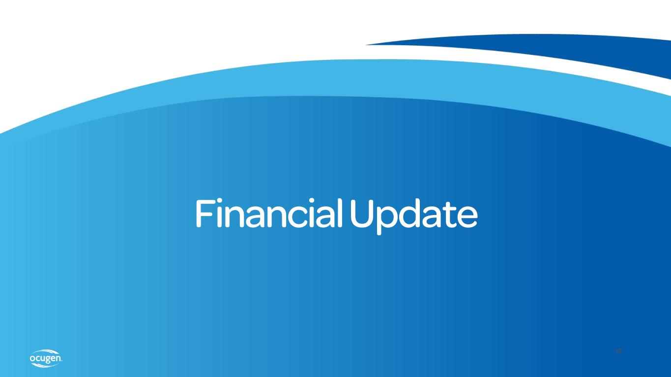 Pipeline Updates OCU200 • IND submitted. The Company plans to respond promptly to get FDA clearance to initiate Phase 1 trial. NeoCart® • Renovations continue on cGMP manufacturing facility for NeoCart • Completion planned for 4Q 2023 14