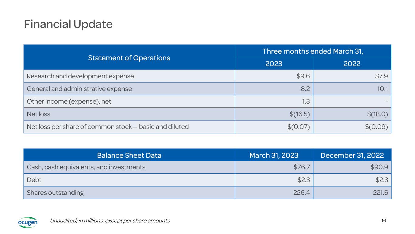 Financial Update Statement of Operations Three months ended March 31, 2023 2022 Research and development expense $9.6 $7.9 General and administrative expense 8.2 10.1 Other income (expense), net 1.3 - Net loss $(16.5) $(18.0) Net loss per share of common stock — basic and diluted $(0.07) $(0.09) Balance Sheet Data March 31, 2023 December 31, 2022 Cash, cash equivalents, and investments $76.7 $90.9 Debt $2.3 $2.3 Shares outstanding 226.4 221.6 Unaudited; in millions, except per share amounts 16