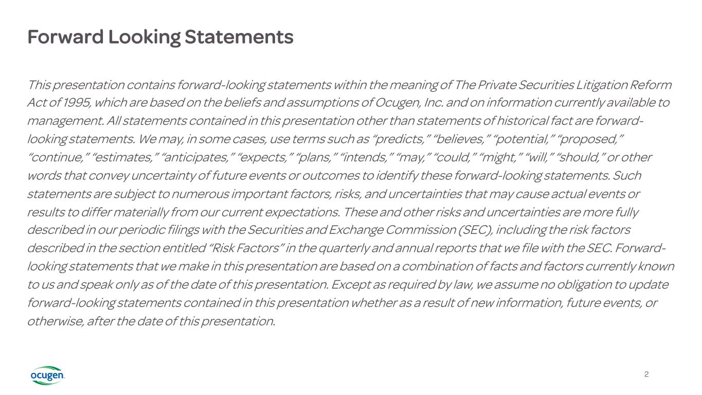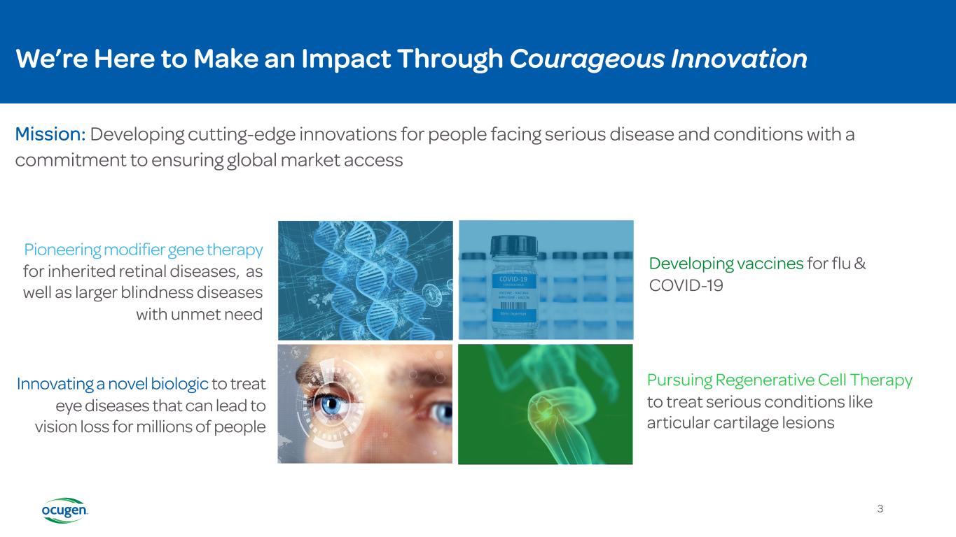 Forward Looking Statements 2 This presentation contains forward-looking statements within the meaning of The Private Securities Litigation Reform Act of 1995, which are based on the beliefs and assumptions of Ocugen, Inc. and on information currently available to management. All statements contained in this presentation other than statements of historical fact are forward- looking statements. We may, in some cases, use terms such as “predicts,” “believes,” “potential,” “proposed,” “continue,” “estimates,” “anticipates,” “expects,” “plans,” “intends,” “may,” “could,” “might,” “will,” “should,” or other words that convey uncertainty of future events or outcomes to identify these forward-looking statements. Such statements are subject to numerous important factors, risks, and uncertainties that may cause actual events or results to differ materially from our current expectations. These and other risks and uncertainties are more fully described in our periodic filings with the Securities and Exchange Commission (SEC), including the risk factors described in the section entitled “Risk Factors” in the quarterly and annual reports that we file with the SEC. Forward- looking statements that we make in this presentation are based on a combination of facts and factors currently known to us and speak only as of the date of this presentation. Except as required by law, we assume no obligation to update forward-looking statements contained in this presentation whether as a result of new information, future events, or otherwise, after the date of this presentation.