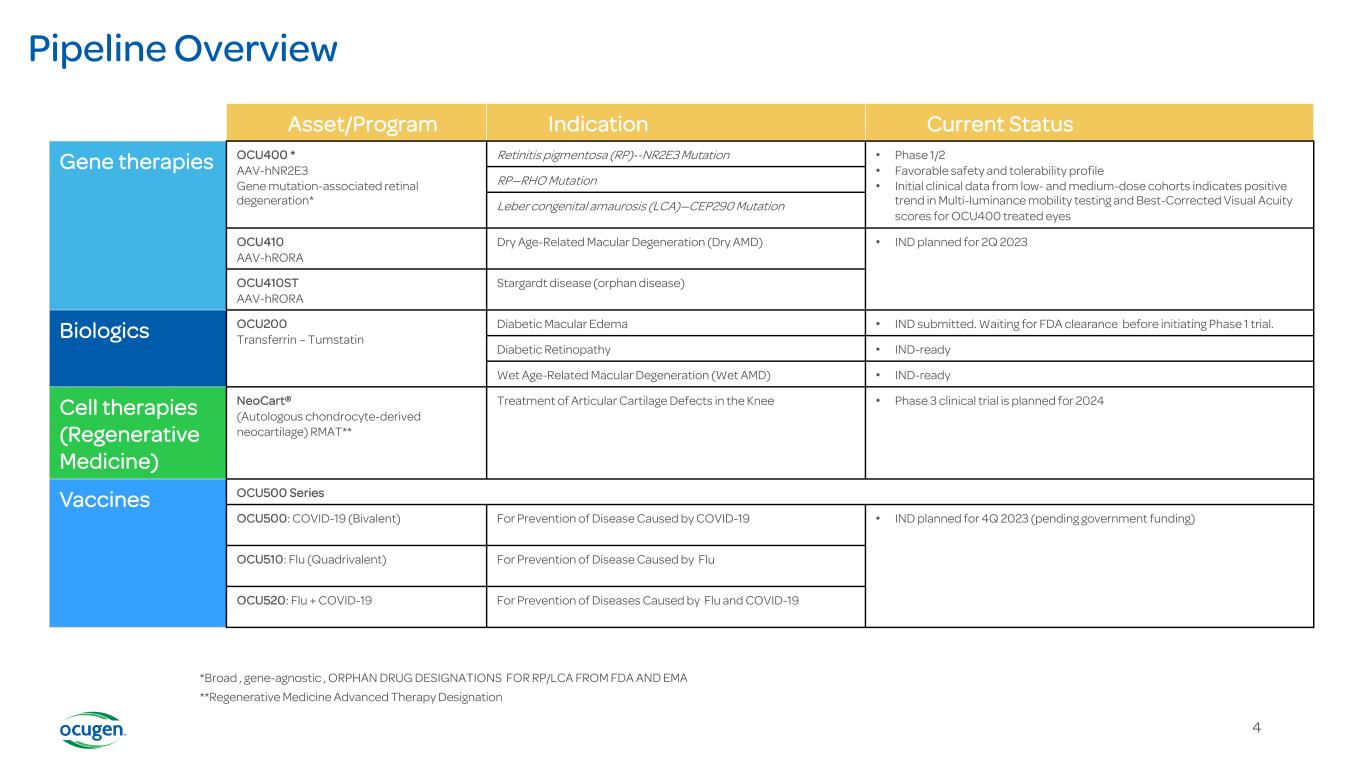 We’re Here to Make an Impact Through Courageous Innovation 3 Mission: Developing cutting-edge innovations for people facing serious disease and conditions with a commitment to ensuring global market access Pioneering modifier gene therapy for inherited retinal diseases, as well as larger blindness diseases with unmet need Innovating a novel biologic to treat eye diseases that can lead to vision loss for millions of people Developing vaccines for flu & COVID-19 Pursuing Regenerative Cell Therapy to treat serious conditions like articular cartilage lesions