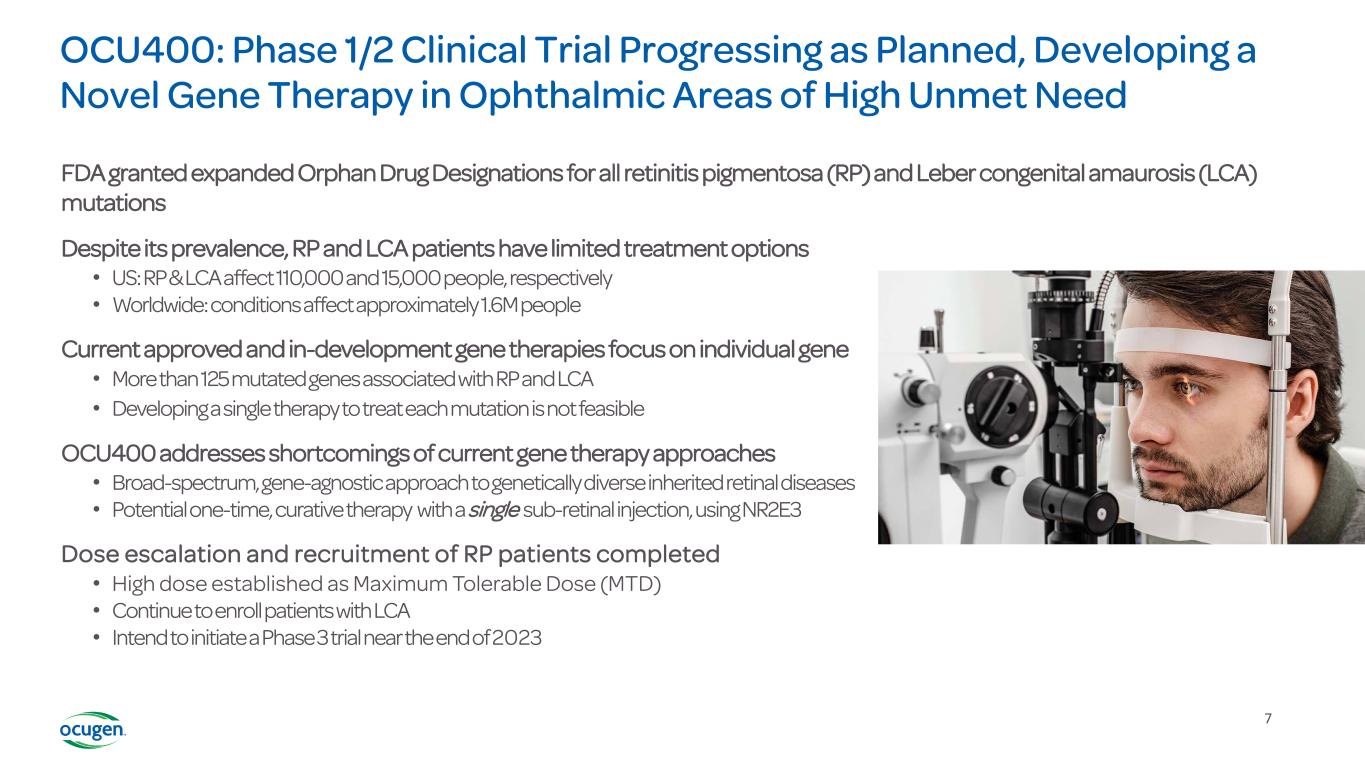 6 Modifier Gene Therapy: A Broader Reach Gene modifier therapy can potentially address multiple genetic defects with a single product utilizing a gene agnostic approach. In patients with IRDs, this could mean: Improved visual outcomes and quality of life GENE X GENE M cell NR2E3 Delivery “Molecular reset” of health & survival gene networks Cell with normal function cell Restored retinal cell homeostasis O N L ONL/photoreceptor survival GENE X cell GENE M Cell with mutated/ nonfunctioning gene(s) other than modifier gene M O D I F I E R G E N E M