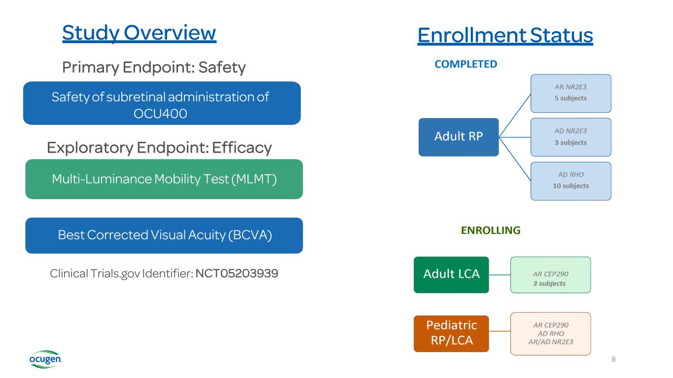 FDA granted expanded Orphan Drug Designations for all retinitis pigmentosa (RP) and Leber congenital amaurosis (LCA) mutations Despite its prevalence, RP and LCA patients have limited treatment options • US: RP & LCA affect 110,000 and 15,000 people, respectively • Worldwide: conditions affect approximately 1.6M people Current approved and in-development gene therapies focus on individual gene • More than 125 mutated genes associated with RP and LCA • Developing a single therapy to treat each mutation is not feasible OCU400 addresses shortcomings of current gene therapy approaches • Broad-spectrum, gene-agnostic approach to genetically diverse inherited retinal diseases • Potential one-time, curative therapy with a single sub-retinal injection, using NR2E3 Dose escalation and recruitment of RP patients completed • High dose established as Maximum Tolerable Dose (MTD) • Continue to enroll patients with LCA • Intend to initiate a Phase 3 trial near the end of 2023 7 OCU400: Phase 1/2 Clinical Trial Progressing as Planned, Developing a Novel Gene Therapy in Ophthalmic Areas of High Unmet Need