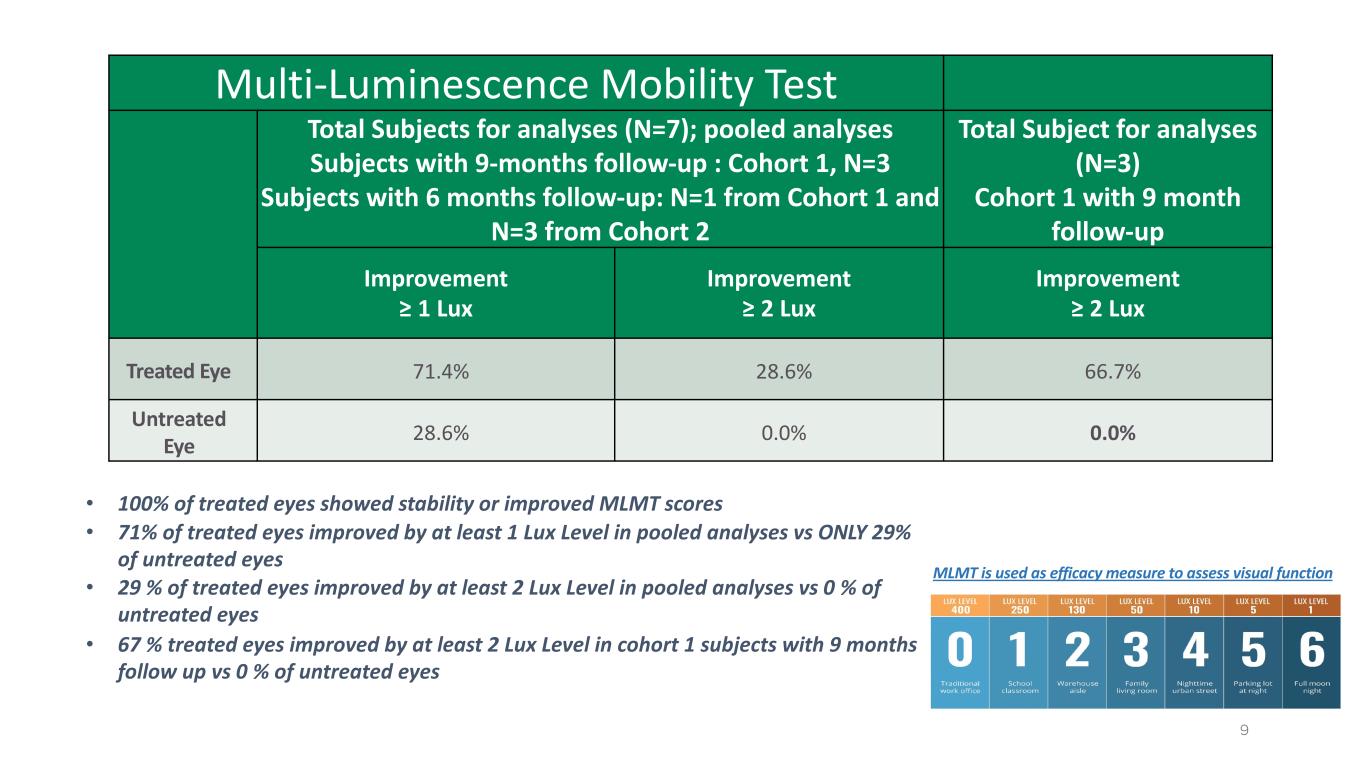 Multi-Luminescence Mobility Test Total Subjects for analyses (N=7); pooled analyses Subjects with 9-months follow-up : Cohort 1, N=3 Subjects with 6 months follow-up: N=1 from Cohort 1 and N=3 from Cohort 2 Total Subject for analyses (N=3) Cohort 1 with 9 month follow-up Improvement ≥ 1 Lux Improvement ≥ 2 Lux Improvement ≥ 2 Lux Treated Eye 71.4% 28.6% 66.7% Untreated Eye 28.6% 0.0% 0.0% • 100% of treated eyes showed stability or improved MLMT scores • 71% of treated eyes improved by at least 1 Lux Level in pooled analyses vs ONLY 29% of untreated eyes • 29 % of treated eyes improved by at least 2 Lux Level in pooled analyses vs 0 % of untreated eyes • 67 % treated eyes improved by at least 2 Lux Level in cohort 1 subjects with 9 months follow up vs 0 % of untreated eyes MLMT is used as efficacy measure to assess visual function 9