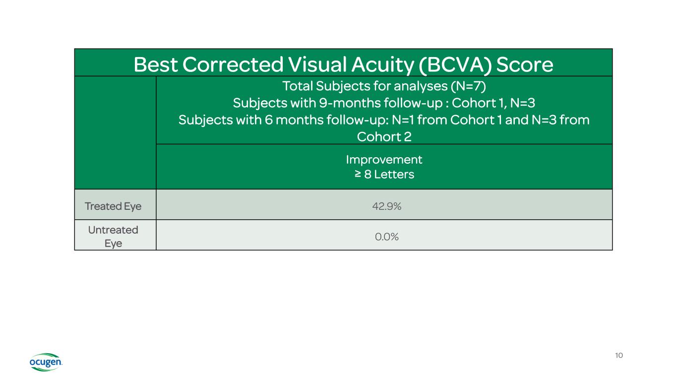 Best Corrected Visual Acuity (BCVA) Score Total Subjects for analyses (N=7) Subjects with 9-months follow-up : Cohort 1, N=3 Subjects with 6 months follow-up: N=1 from Cohort 1 and N=3 from Cohort 2 Improvement ≥ 8 Letters Treated Eye 42.9% Untreated Eye 0.0% 10