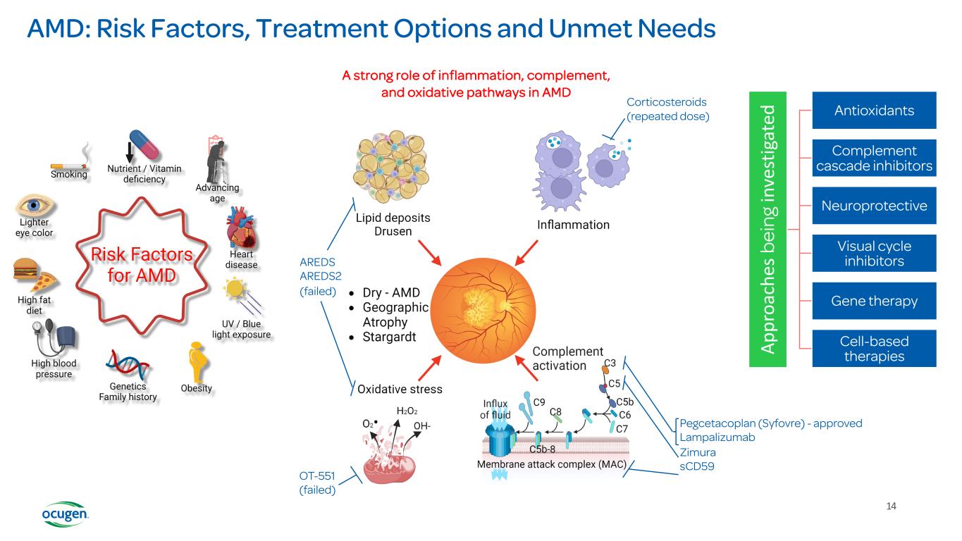 13 OCU410 for the Treatment of Dry Age-related Macular Degeneration (dAMD) dAMD Limited options, presenting significant unmet medical need • US: 10M • Worldwide: condition affects more than 266M people Recently approved therapy for geographic atrophy (GA)— advanced form of dAMD–has limitations • Frequent intravitreal injections (N ~6-12 doses per year); Patient compliance • Limited effect of GA lesion growth rate • Approximately 12% of patients experience neovascular AMD when the drug is administered every month for two years Plan to submit IND for initiation of Phase 1/2 clinical trial in 2Q 2023 Fatty Deposits