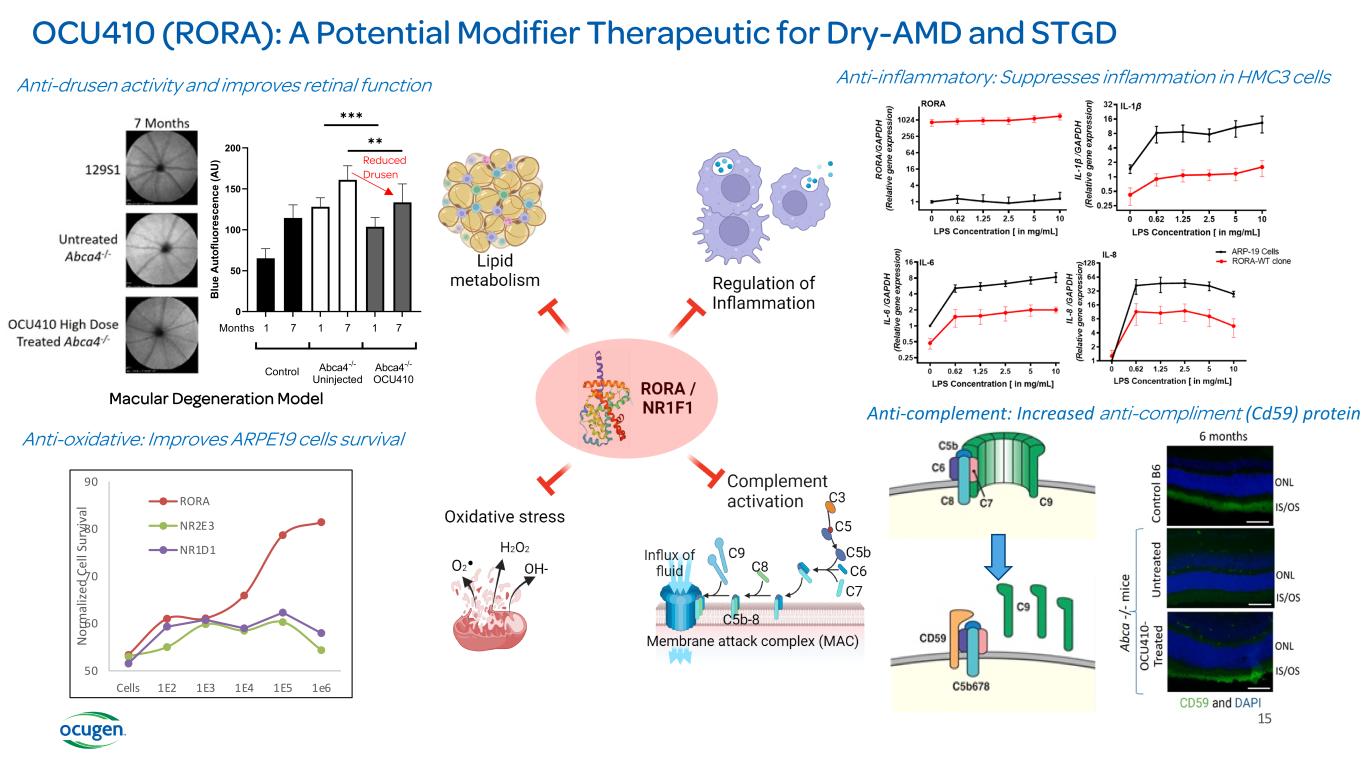 50 60 70 80 90 1e61E51E41E31E2Cells N or m al ize d Ce ll Su rv iv al RORA NR2E3 NR1D1 Anti-oxidative: Improves ARPE19 cells survival Anti-complement: Increased anti-compliment (Cd59) protein Anti-inflammatory: Suppresses inflammation in HMC3 cellsAnti-drusen activity and improves retinal function 0 50 100 150 200 B lu e A ut of lu or es ce nc e (A U) Months 1 7 1 7 1 7 Control Abca4-/- Uninjected Abca4-/- OCU410 ✱✱ ✱✱✱ Macular Degeneration Model Reduced Drusen 15 OCU410 (RORA): A Potential Modifier Therapeutic for Dry-AMD and STGD