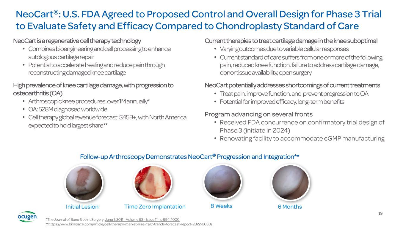 19 *The Journal of Bone & Joint Surgery: June 1, 2011 - Volume 93 - Issue 11 - p 994-1000 **https://www.biospace.com/article/cell-therapy-market-size-cagr-trends-forecast-report-2022-2030/ NeoCart is a regenerative cell therapy technology • Combines bioengineering and cell processing to enhance autologous cartilage repair • Potential to accelerate healing and reduce pain through reconstructing damaged knee cartilage High prevalence of knee cartilage damage, with progression to osteoarthritis (OA) • Arthroscopic knee procedures: over 1M annually* • OA: 528M diagnosed worldwide • Cell therapy global revenue forecast: $45B+, with North America expected to hold largest share** Current therapies to treat cartilage damage in the knee suboptimal • Varying outcomes due to variable cellular responses • Current standard of care suffers from one or more of the following: pain, reduced knee function, failure to address cartilage damage, donor tissue availability, open surgery NeoCart potentially addresses shortcomings of current treatments • Treat pain, improve function, and prevent progression to OA • Potential for improved efficacy, long-term benefits Program advancing on several fronts • Received FDA concurrence on confirmatory trial design of Phase 3 (initiate in 2024) • Renovating facility to accommodate cGMP manufacturing Follow-up Arthroscopy Demonstrates NeoCart® Progression and Integration** Initial Lesion Time Zero Implantation 8 Weeks 6 Months NeoCart®: U.S. FDA Agreed to Proposed Control and Overall Design for Phase 3 Trial to Evaluate Safety and Efficacy Compared to Chondroplasty Standard of Care