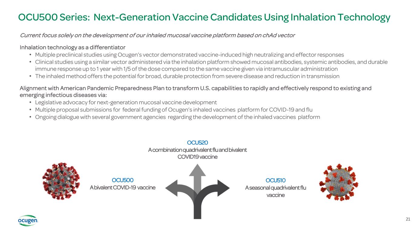 20 OCU500 Series: OCU500: COVID-19 Mucosal Vaccine OCU510: Flu OCU520: COVID-19/Flu