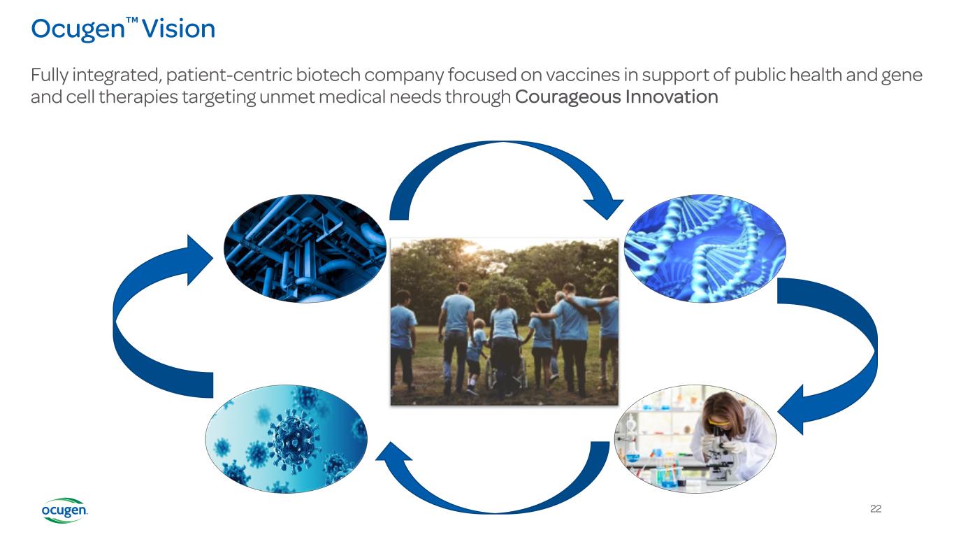 21 OCU500 Series: Next-Generation Vaccine Candidates Using Inhalation Technology OCU500 A bivalent COVID-19 vaccine OCU510 A seasonal quadrivalent flu vaccine OCU520 A combination quadrivalent flu and bivalent COVID19 vaccine Current focus solely on the development of our inhaled mucosal vaccine platform based on chAd vector Inhalation technology as a differentiator • Multiple preclinical studies using Ocugen’s vector demonstrated vaccine-induced high neutralizing and effector responses • Clinical studies using a similar vector administered via the inhalation platform showed mucosal antibodies, systemic antibodies, and durable immune response up to 1 year with 1/5 of the dose compared to the same vaccine given via intramuscular administration • The inhaled method offers the potential for broad, durable protection from severe disease and reduction in transmission Alignment with American Pandemic Preparedness Plan to transform U.S. capabilities to rapidly and effectively respond to existing and emerging infectious diseases via: • Legislative advocacy for next-generation mucosal vaccine development • Multiple proposal submissions for federal funding of Ocugen’s inhaled vaccines platform for COVID-19 and flu • Ongoing dialogue with several government agencies regarding the development of the inhaled vaccines platform