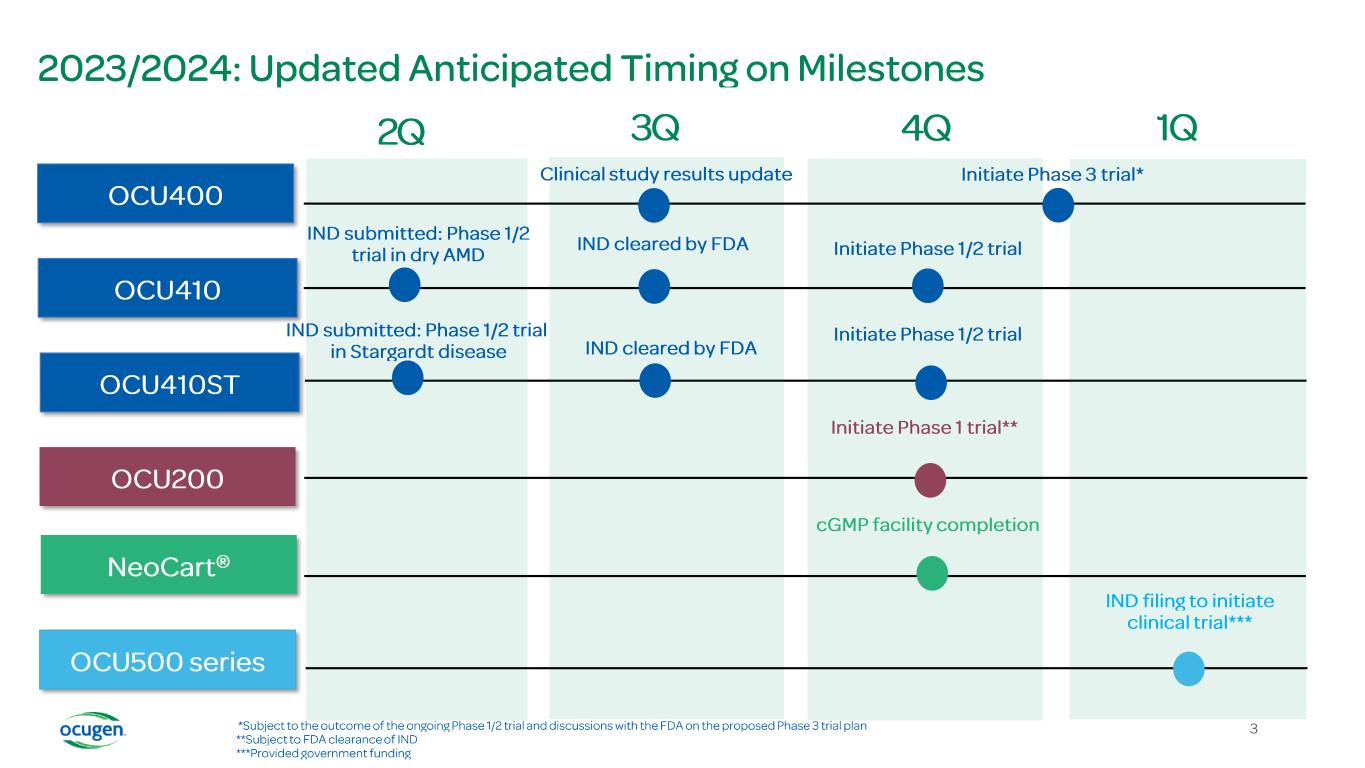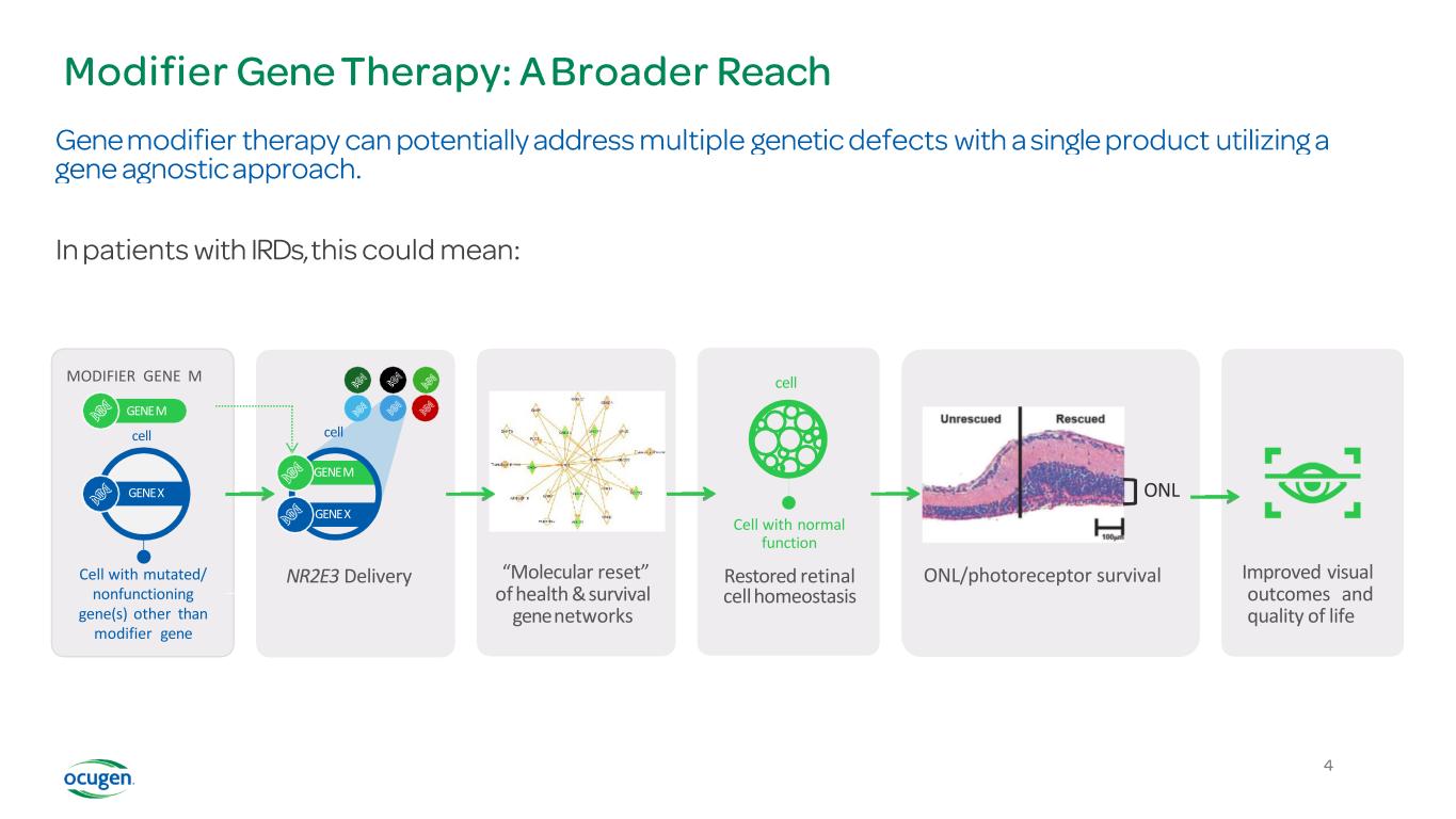 Improved visual outcomes and quality of life GENE X GENE M cell NR2E3 Delivery “Molecular reset” of health & survival gene networks cell Cell with normal function Restored retinal cell homeostasis ONL ONL/photoreceptor survival GENE X Cell with mutated/ nonfunctioning gene(s) other than modifier gene MODIFIER GENE M GENE M cell 2