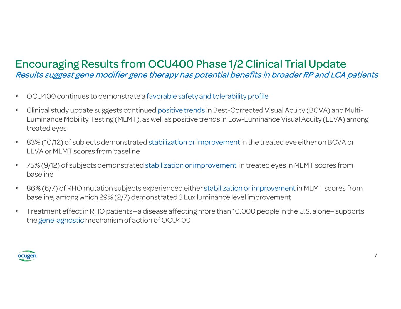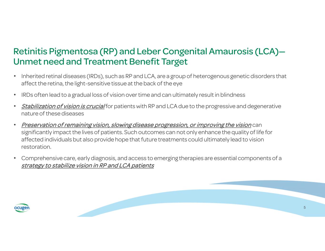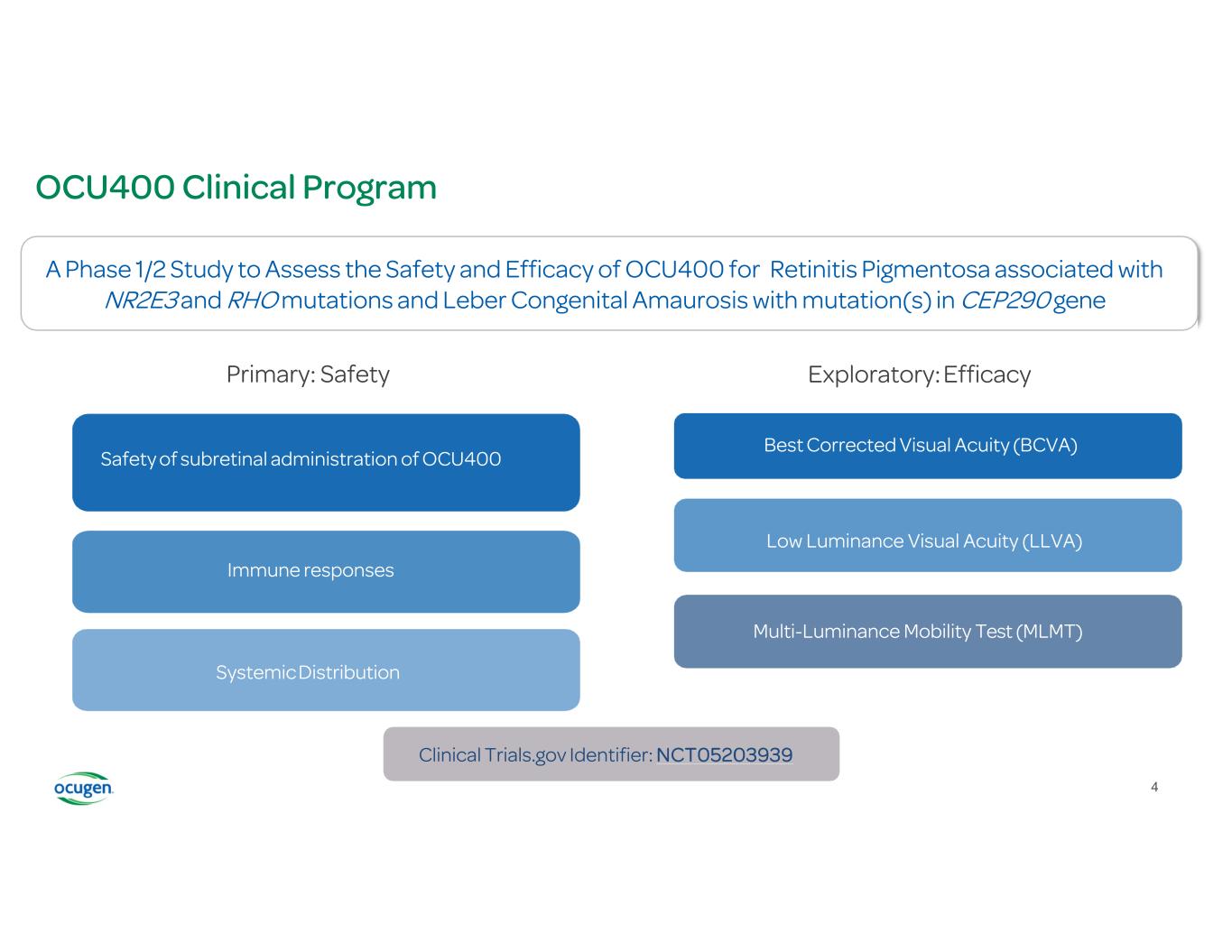 OCU400 Clinical Program A Phase 1/2 Study to Assess the Safety and Efficacy of OCU400 for Retinitis Pigmentosa associated with NR2E3 and RHO mutations and Leber Congenital Amaurosis with mutation(s) in CEP290 gene Clinical Trials.gov Identifier: NCT05203939 Safety of subretinal administration of OCU400 Immune responses Systemic Distribution Best Corrected Visual Acuity (BCVA) Multi-Luminance Mobility Test (MLMT) Low Luminance Visual Acuity (LLVA) Primary: Safety Exploratory: Efficacy 4 4